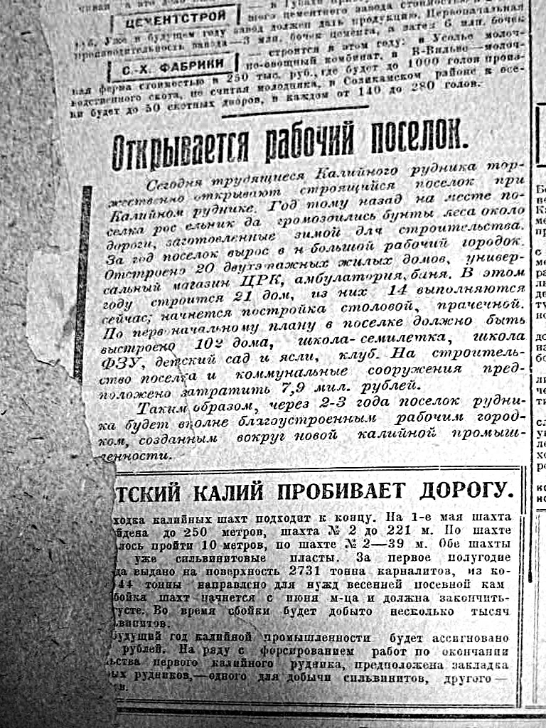 Поселок при калийном руднике. Есть подозрения, что это как раз те здания, что стояли ТУТ. Ударник 1 мая 1930 года