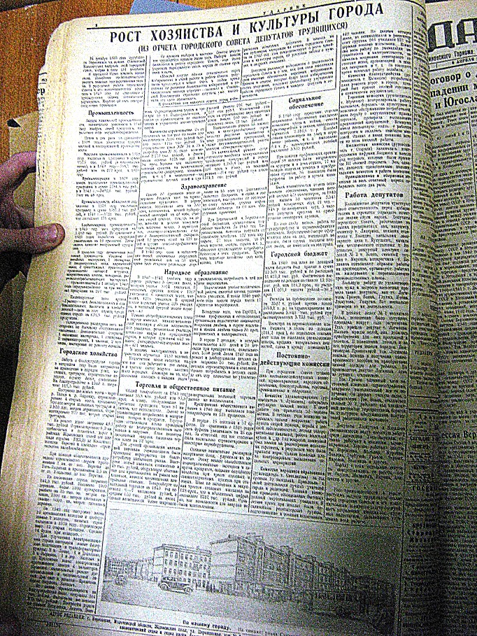 Забаяню фотку - она оказалась из газеты Ударник от 2 апреля 1941 года. К ней была привязана интересная полоса, но качеством не вышла - Рост Хозяйства и культуры города (Из отчет ГорСовета депутатов трудящихся)