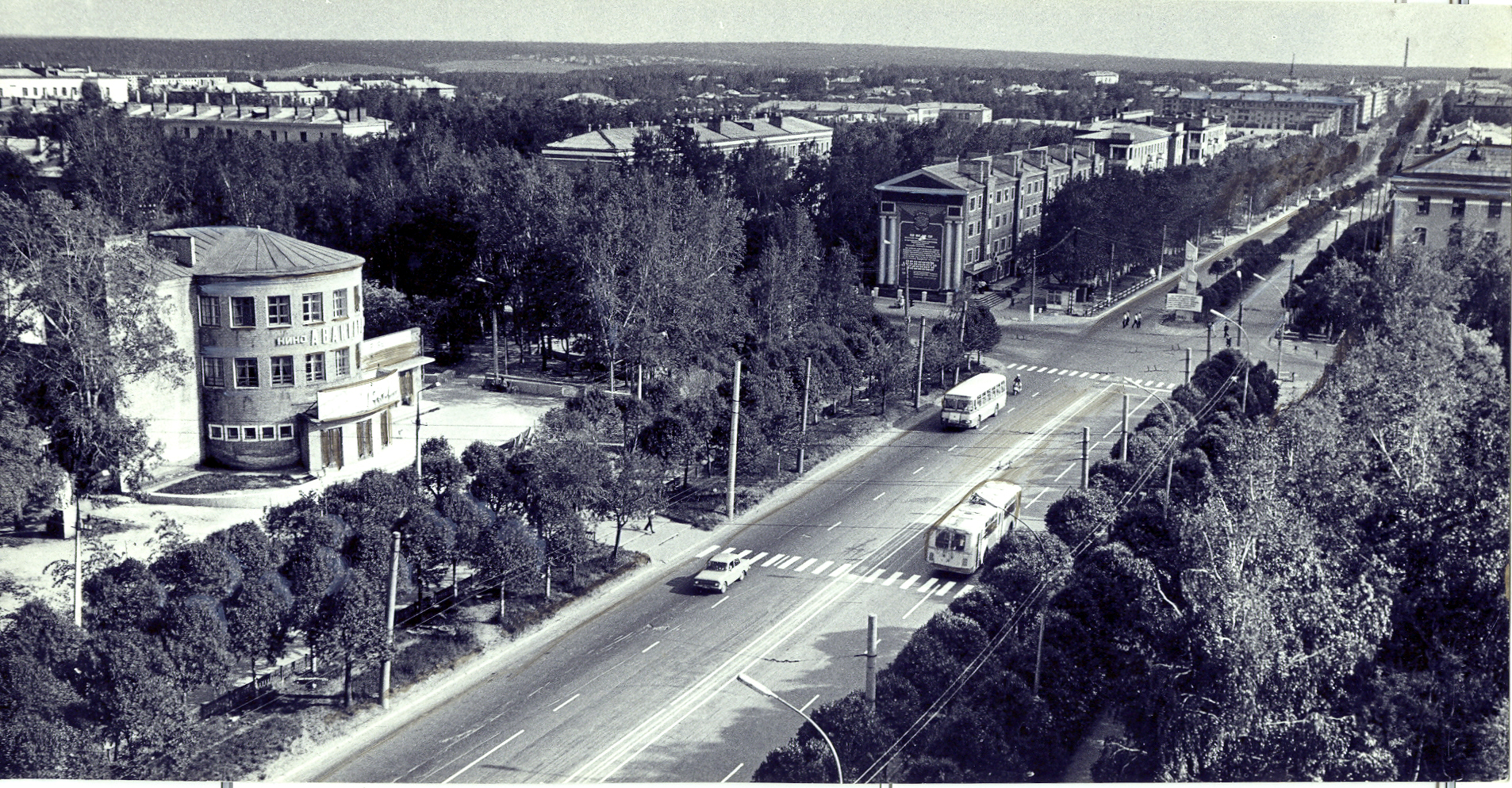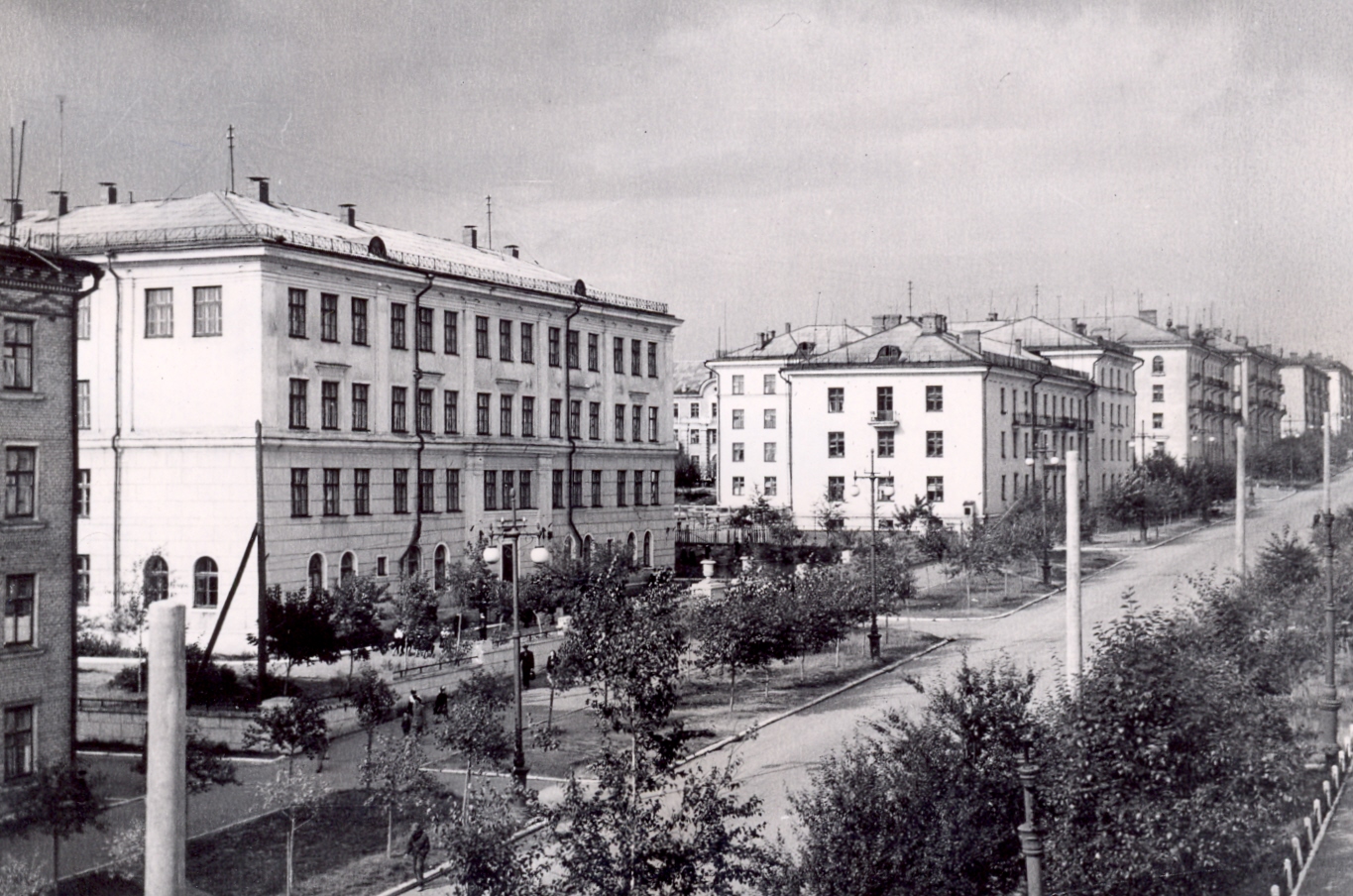 Не помню, в каком точно году сделано фото, но это точно здание школы №7. Там и типа аллея была в своё время и просто газон (школьники его засаживали цветочками). Тополя иногда стриглись "под ноль" до одних стволов голых, потом всё нарастало... Кто сомневается, что это именно здание школы №7? Не сомневайтесь! Я эту школу в своё время оканчивала. Столько лет в неё отходила... :bf: