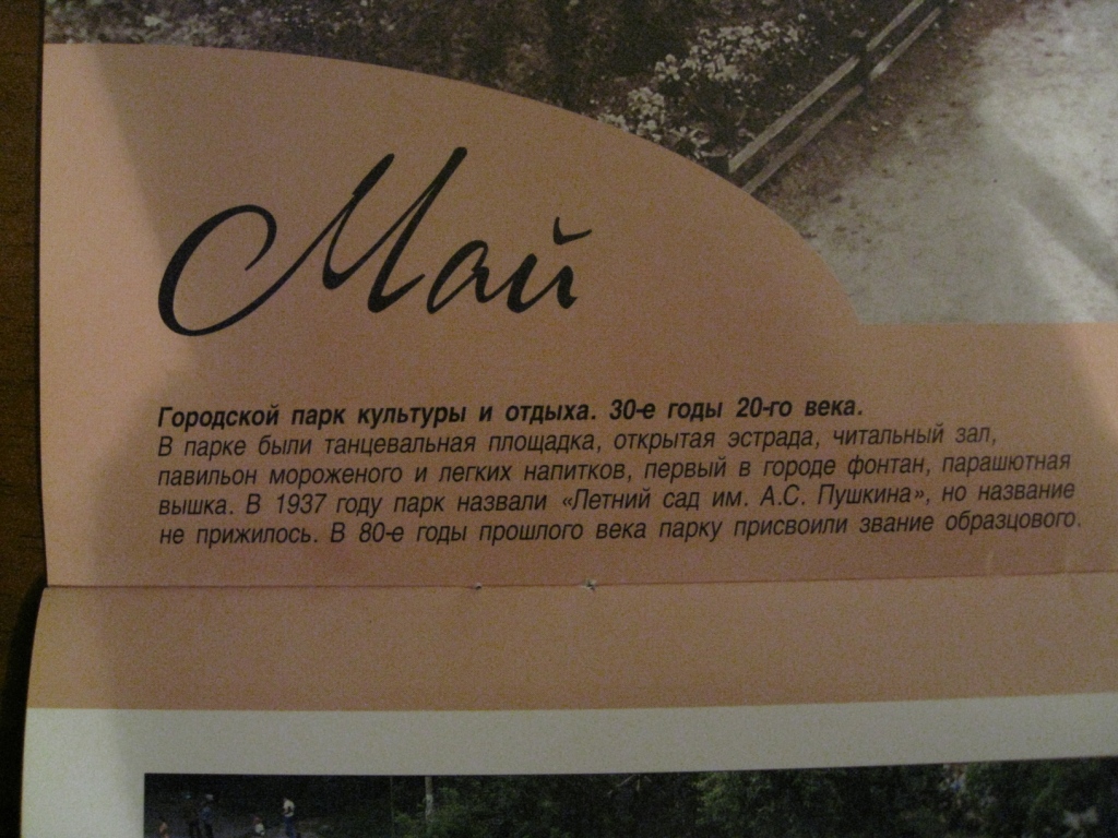 Городской парк культуры и отдыха. Фотки 30-ых годов 20 века. В парке была танцевальная площадка, открытая эстрада, читальный зал, павильон мороженного и легких напитков, первый в городе фонтан, парашютная вышка. В 1937 году парк назвали «Летний сад им. А.С. Пушкина», но название не прижилось. В 80-е годы парку присвоили звание образцового, и стали называть его просто "Городской парк культуры и отдыха".