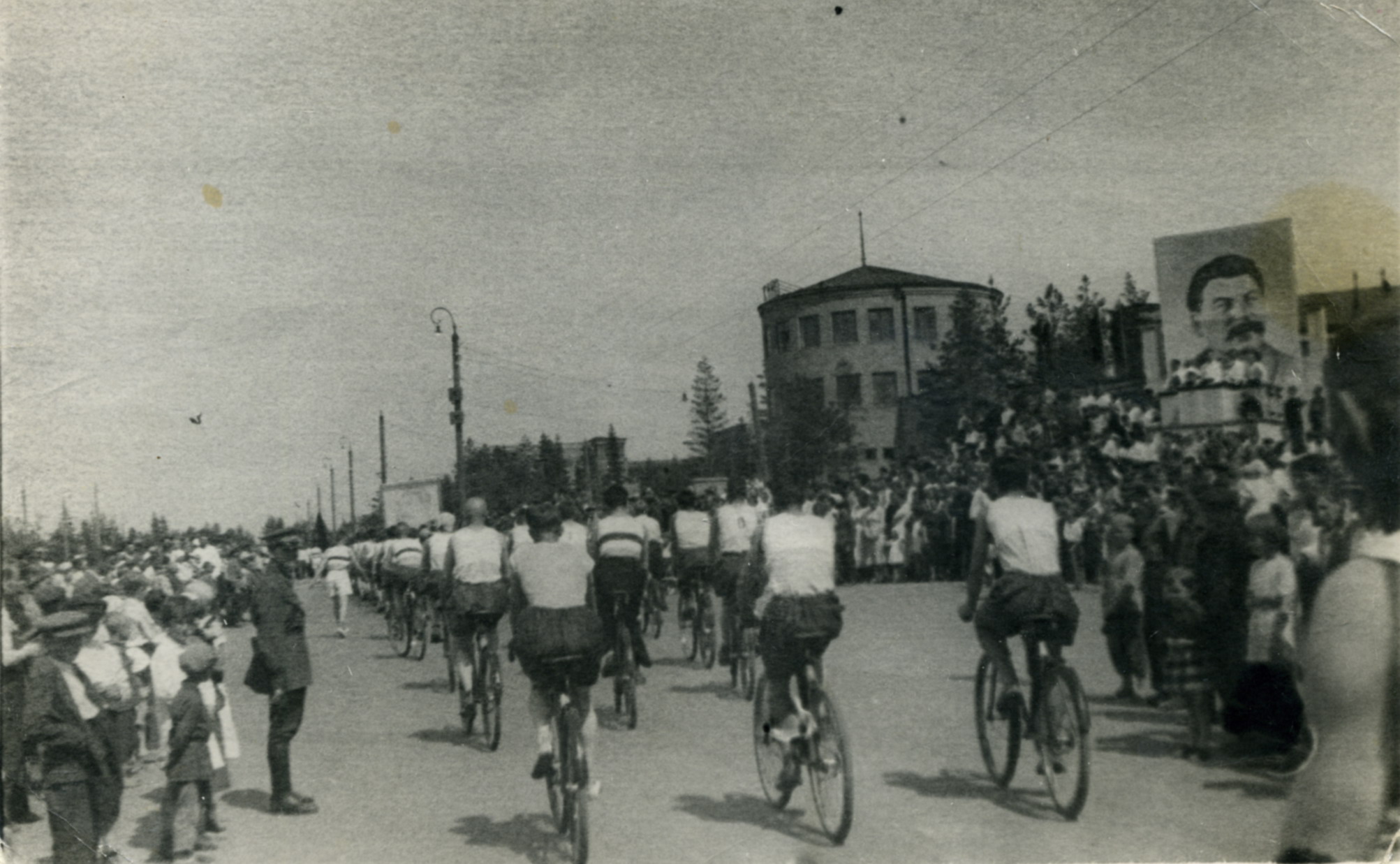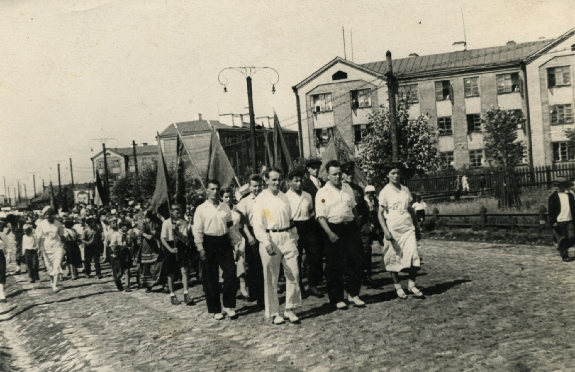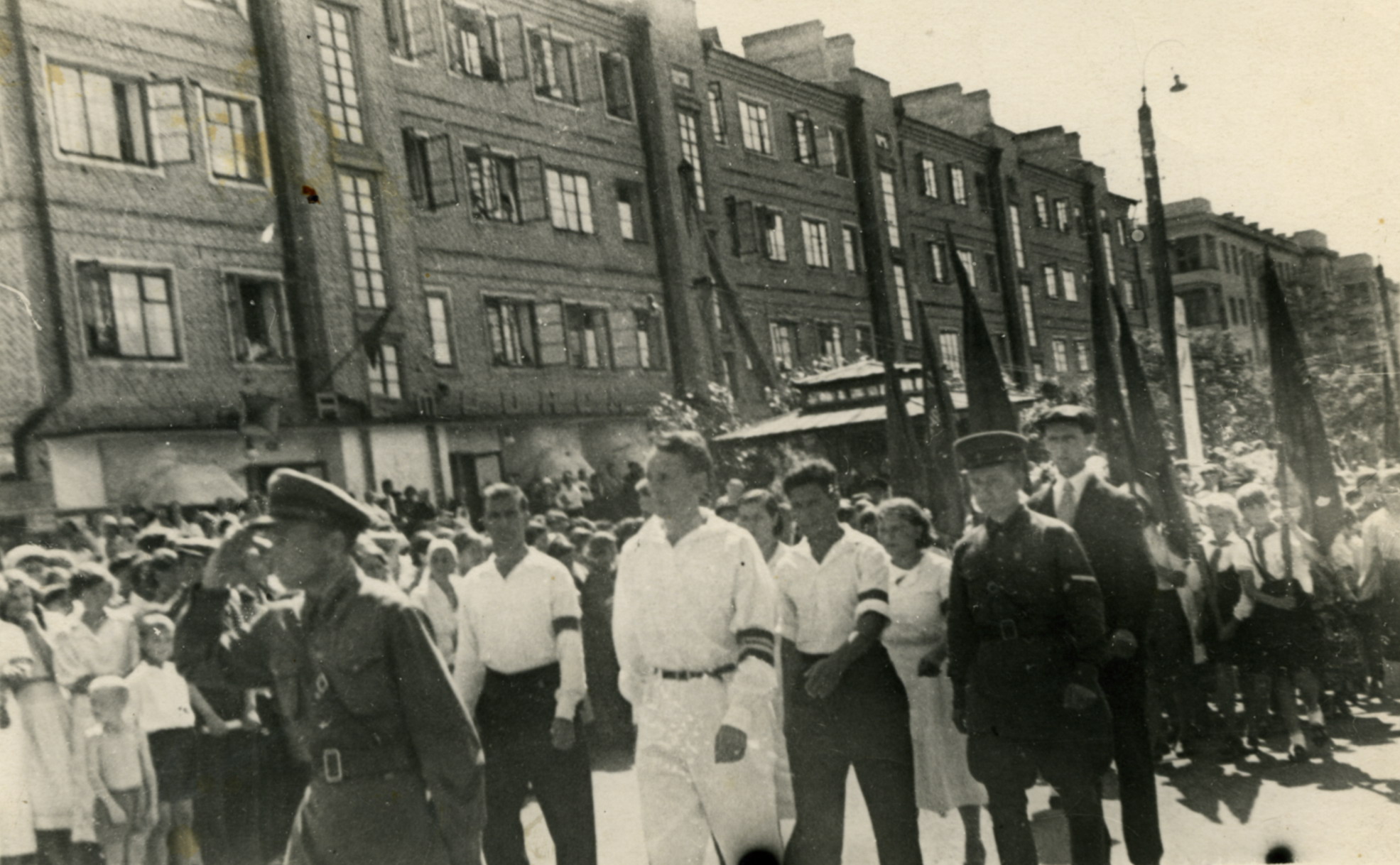 На четвёртой - процессия демонстрации шагает по проспекту Сталина (ныне ул.Ленина) мимо "Гастронома", в котором в наши годы уже были кафе "Берёзка", игровой клуб...