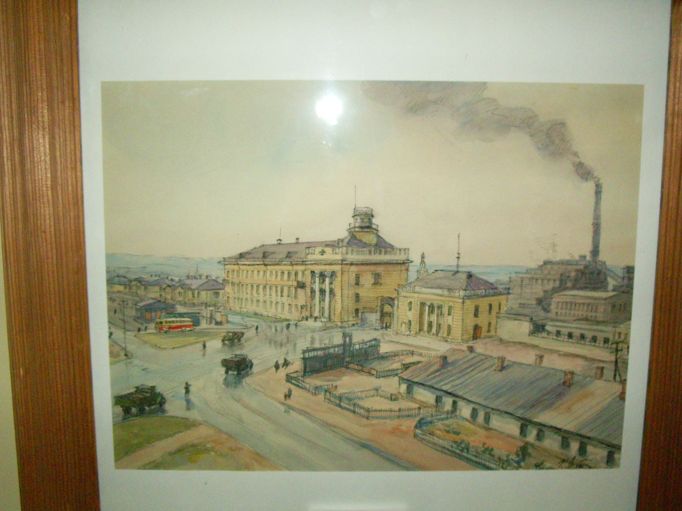 Лехт немного исказил перспективу? Автобус стоит скорей не на оси арка-ворота, а на уровне входа в Управление и даже чуть-чуть дальше. Из арки троллейбус было нереально увидеть, если картина соответствует реальности. Возможно остановка троллейбуса была ближе. Но я снова повторю вопрос - куда крепились троллеи поворотного кольца? Самый подходящий вариант - дом Горького 1 и на столб, ныне живущий на площади. А современный столб стоит дальше оси Арка-Ворота