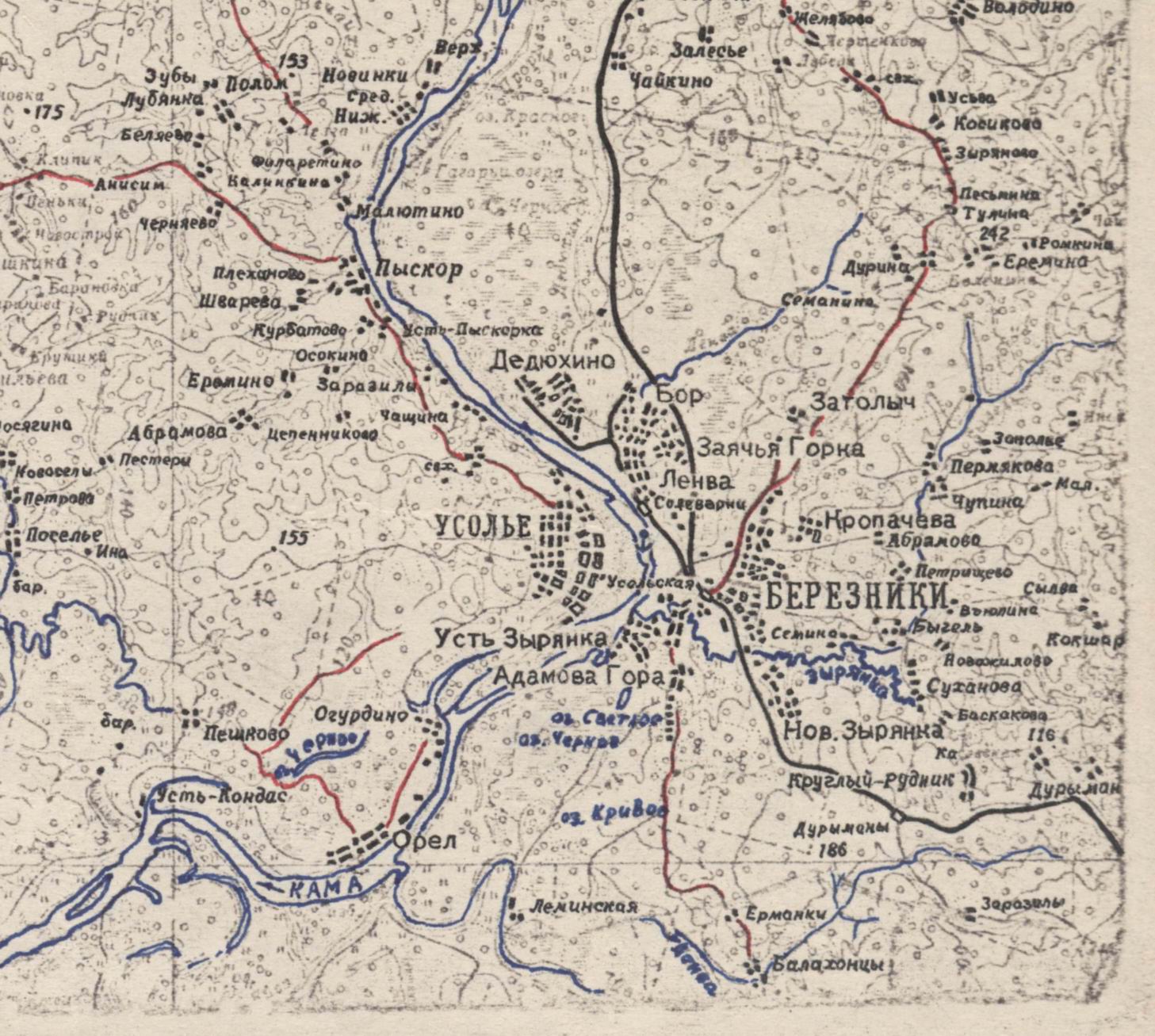 По той карте, фрагмент которой выкладывал, определил координаты ст. Солеварни (59 град. 25' 23,4" и 56 град. 43' 53,4") и нашёл эту точку в гугле. Вот что получилось. O:) Боюсь что это очень-очень приблизительно.