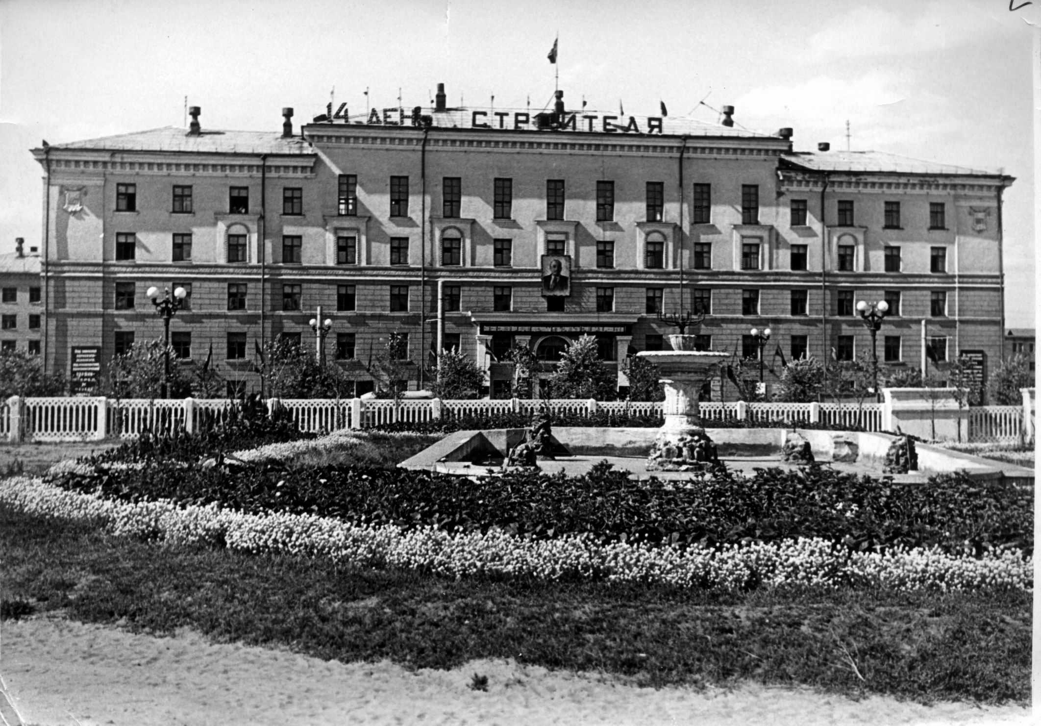 Так как из-за угла справа от треста№1 "выглядывает" здание "старого" горисполкома, то можно определить верхнюю границу даты съемки. Ну и на фронтоне здания- "14- день строителя" то и нижнюю границу можно определить по году учреждения этого праздника. Само здание построено в 1957 году (дата на обоих углах здания).