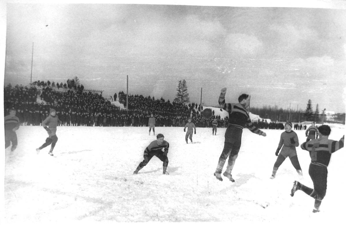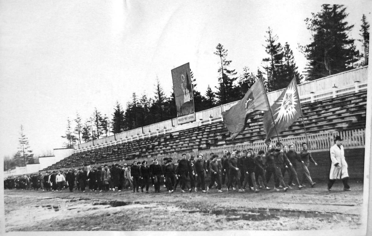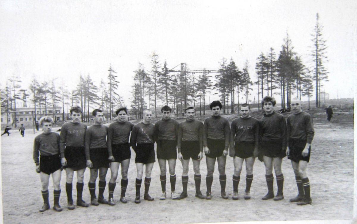 Футболисты на каком-то стадионе. Вспомнилась улица Футбольная и Физкультурников, которые ныне Красноборова и Бирюковой. Может там? Место не узнал.