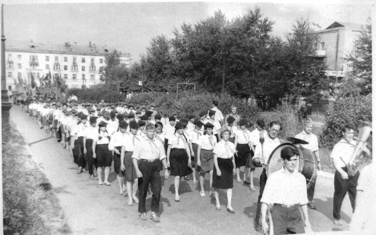 Колонна пионэров у дома Сталина 45. А справа виден домик 66, который неоднократно вызывал обсуждения.