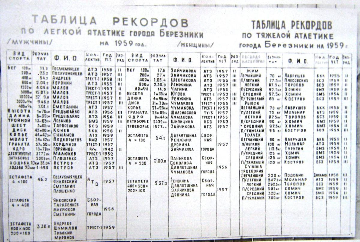 Таблица рекордов города по легкой и тяжелой атлетике 1959 года.