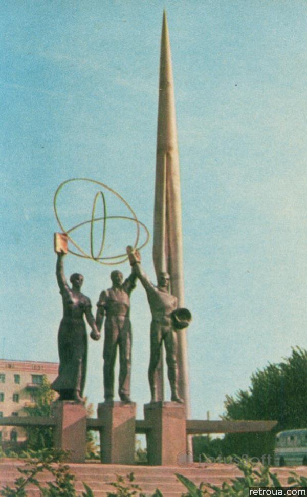 Вроде он именовался "Покорители (чего-то там не знаю)", раз рабочий, космонавт (ракета ?) и ученая девушка. Вместе они - сила. Опять же точной информации по установке не знаю. Фото явно уже после 1962 года и состояние скульптурной группы не ахти.