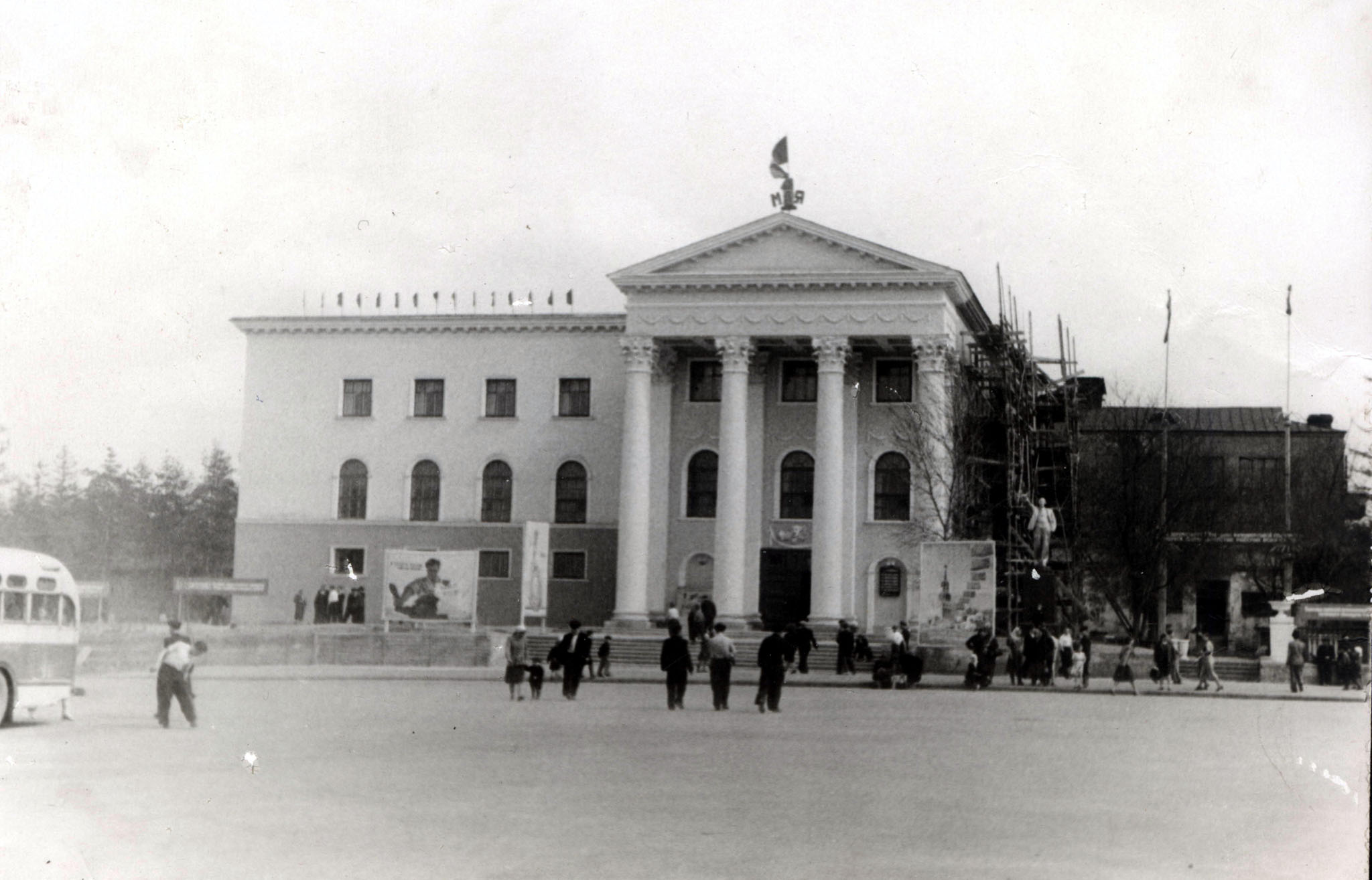 Всем привет, пытался через Photoshop прочитать плакаты - невозможно.Леса справа от Дворца натолкнули на мысль, что бывший там когда-то кинотеатр, кажется "Искра", был моложе дворца. Не помню как заходили в кино, но хорошо помню как спускались вниз по наружным металлическим лестницам:-k