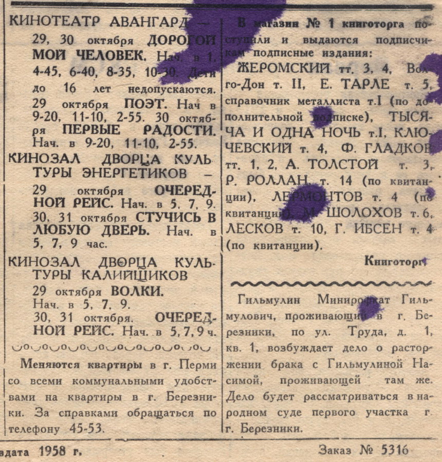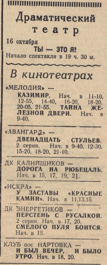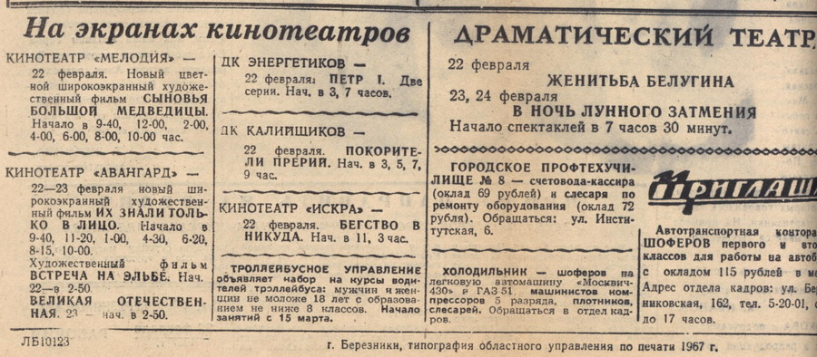 Октябрь 1958. Появились ещё и кинозалы ДК Энергетиков и ДК Калийщиков.