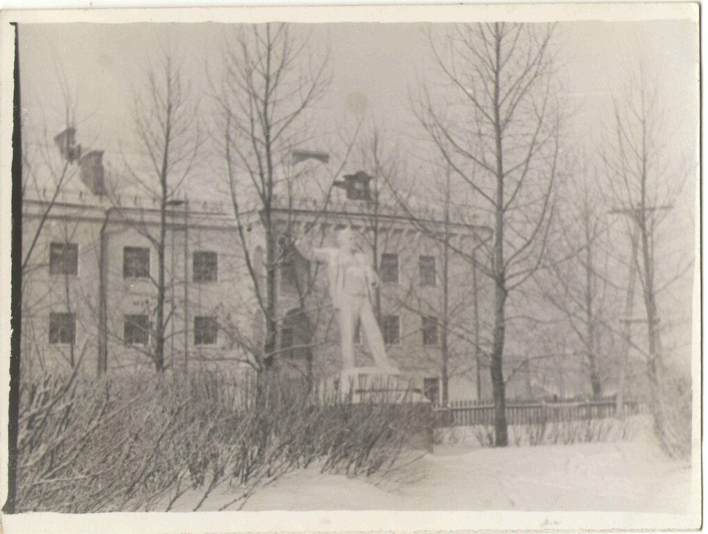 Говорили,что там И.Сталин стоял до 1961 г.у корпуса 3,постамент хорошо сохранился,сегодня оттуда.Вот и фото нашлось,но тут на Ленина больше похож,сколько он тут стоял?