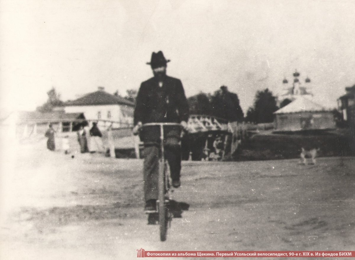 На фотографии, которая датируется 90-ми годами XIX в. – первый усольский велосипедист.