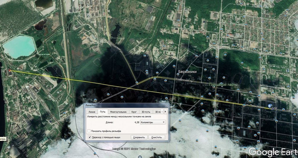 Нашёл на Гугл Земле эти колонны. Я их на самом деле мог и не видеть, так далеко на территорию завода мы не ходили, да и по сторонам не очень то озирались, молодые пацаны, оно нужно нам было в то время какие-то сооружения рассматривать, другие занятия были, поинтереснее! Вот расстояние до этих колонн от примерной точки съёмки впечатляет: 4 с лишним километра! Таким образом признаю ошибочность моих измышлений, это наши родные Березники!