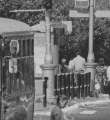 С правой стороны вдалеке троль к остановке подъехал. Зная примерно расстояние между опорами освещения (вроде 25-28 метров) и пересчитав эти опоры(я насчитал 14 или 15 штук) мы можем определить остановку. Это может "Нижний ЦУМ"? Там ведь была остановка. Кроме троллейбусов автобус "А" магневиков останавливался.
