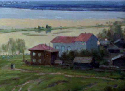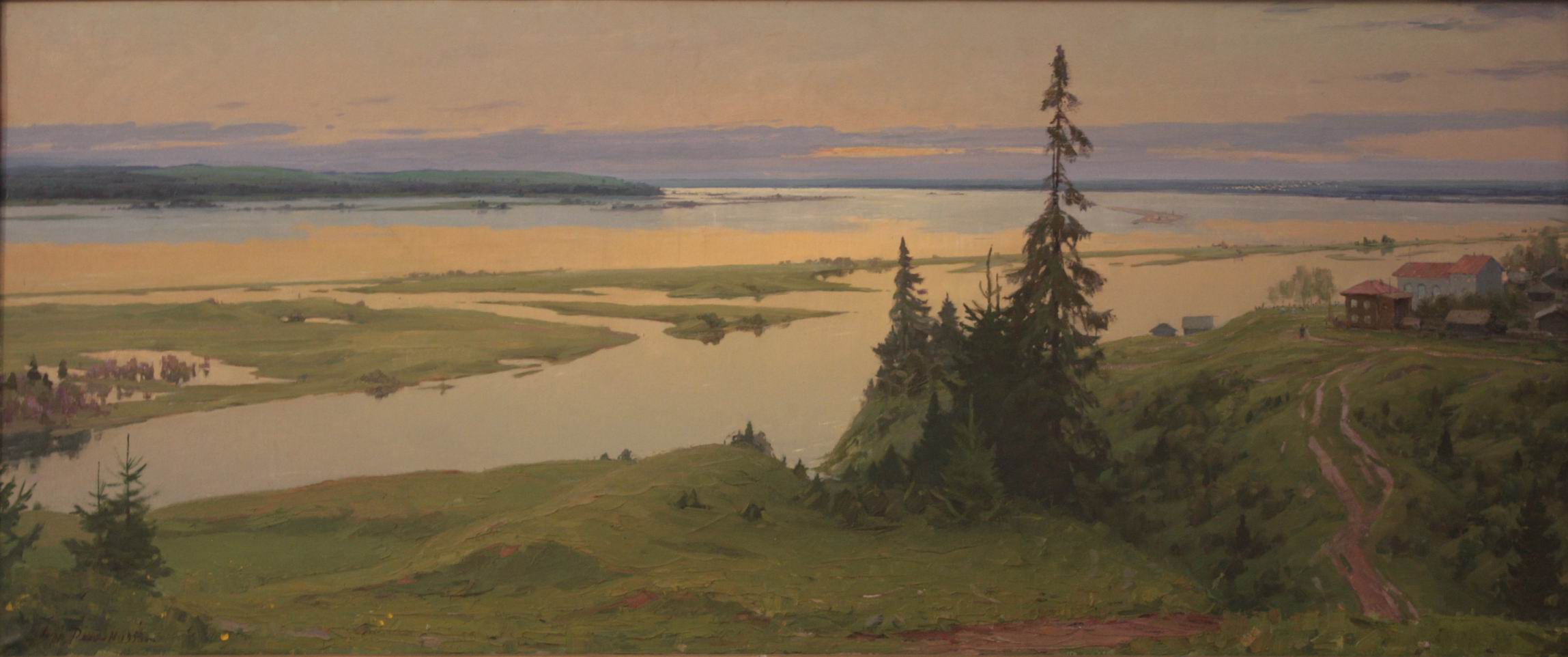 картина называется "Разлив на Каме". Островки похожи на те что возле Усолья, но горки такой там нету...
