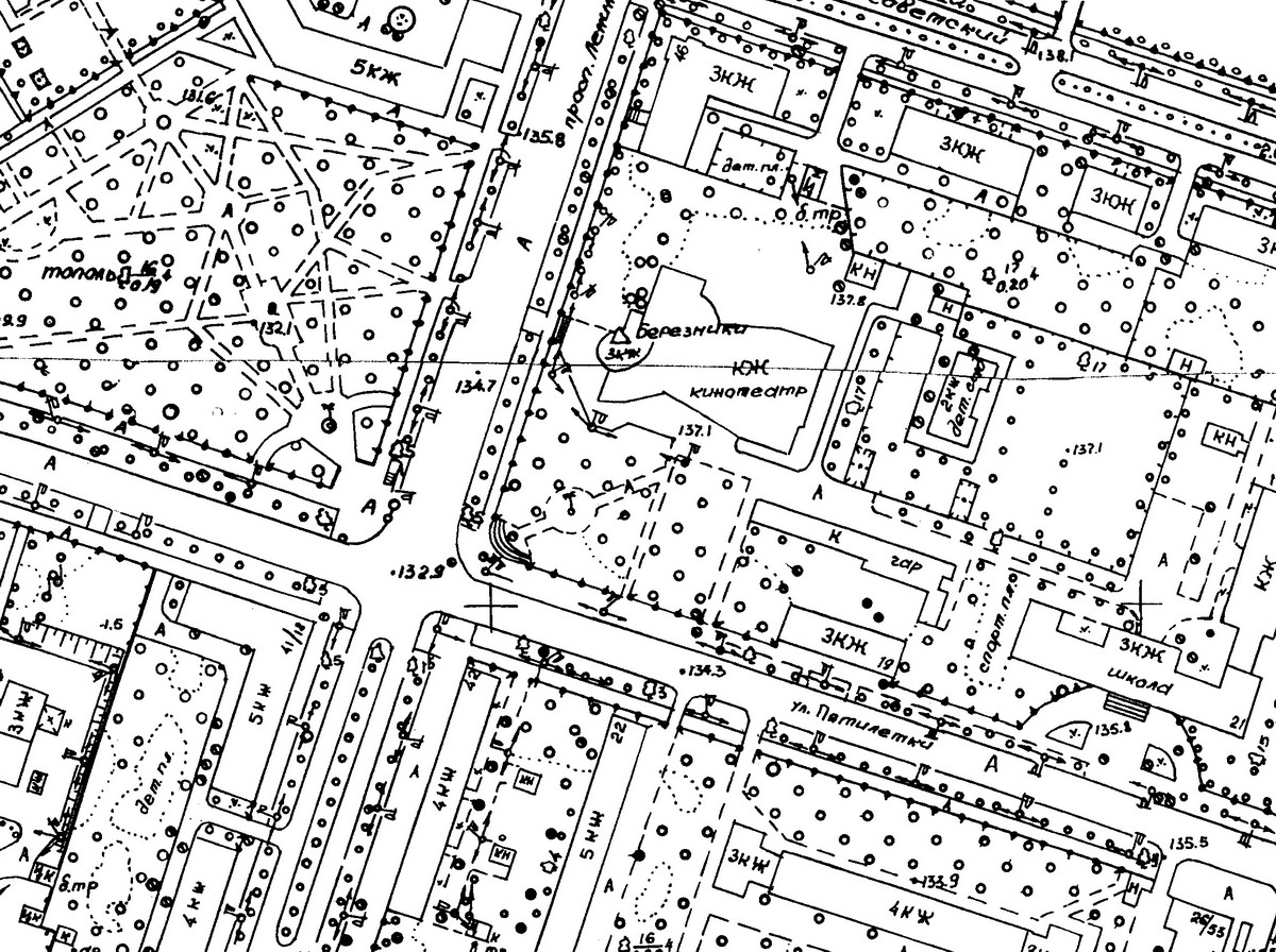Попался мне на глаза фрагмент карты - район перекрёсток Ленина-Пятилетки. Не совсем понятные цифры, обозначения. Узнал только 2 фонтана - у АВАНГАРДА и в Треугольном сквере? Для какого года она сделана? Была привязана к Генеральному плану МО г. Березники, выполненного РосНИПИУрбанистики в Спб в 2003 г. Самой карты там не оказалось...