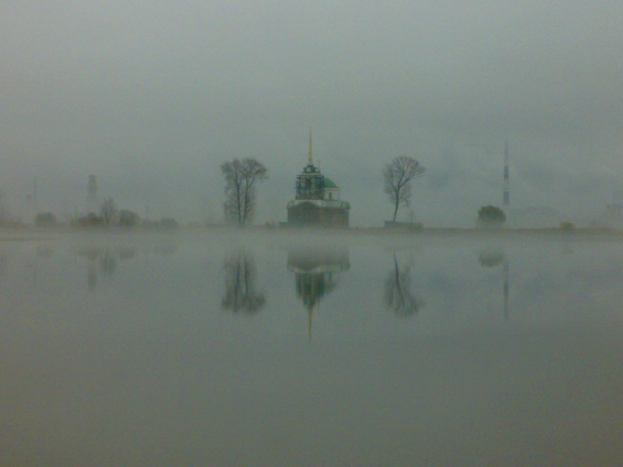 Белеющее каменное здание за деревьями, по-моему, это школа, находящаяся через залив от Никольской церкви.