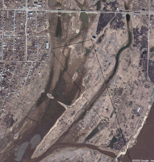 По поводу ПТ-80, фотография, на мой взгляд, сделана с протоки между старым городом и островной частью. Так как колокольня у церкви на фотографии слева, а на местности колокольня у церкиви распологается от купола в сторону старого города. так что вычисляйте.