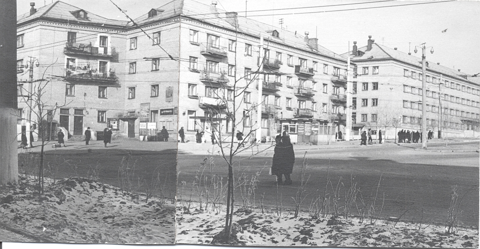 Источник - дама, которая там работала. Там был пункт приема почты и какая-то жилконтора жили они на верхнем этаже этой почты (служебное жилье). Про этажность - двухэтажка. Ниже по той же стороне улицы к пл. Фронтовиков последовательно располагались здания КВД - детский сад - дом пионеров (теперь на их месте гаражи-овощебаза-новое здание под автоцентр