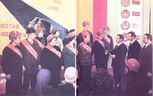 А вот это второе фото содержит церемонию награждения почетной смены по выпуску миллионной тонны. Кажется, аммиака. Человек, который стоит сзади и чуть левее - у стенки с гербами - относительно начальника смены, которому вручают грамоту - мой отец.....