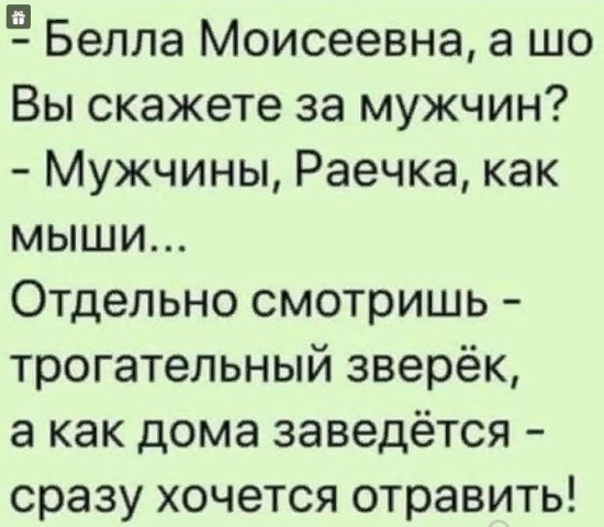 Малышка Опубликовано 9 октября, 2019 Опубликовано 9 октября, 2019 22 часа назад, alngg342 сказал(а) : Нет, эта тема (то, что она вообще была создана) - это лишнее подтверждение политики мизандрии, её распространения на все уровни. буквыцифры, ну с мизандрией на ветке ты конечно перегнул... Так, лёгкий троллинг, не более