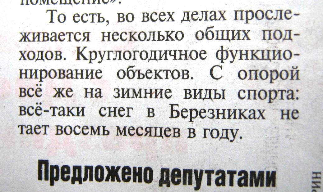 GARRY6491 Опубликовано 1 октября, 2010 Опубликовано 1 октября, 2010 Тема эта будет жить, пока выходят местные газетенки... газетюшки... газетянки... Горгаз за 30 сентября... Читал,всхлипывая, про наш суровый край, в котором 8 месяцев в году не тает снег. =D> Либо он ложится с 1 сентября и лежит до 30 апреля, либо с 1 октября по 31 мая... В остальные 4 месяца он спешит растаять, чтобы снова лечь на 8 месяцев... :wink: Далее - Молодой человек не всегда выговаривает все буквы или, что скорей всего, корреспондент не все буквы слышит, временами пропуская их... Мне показалось, что слишком близко две одинаковые АшЫпки... :dada: И особенно меня потрясли бравые ребята из вневедомственной охраны, в бронежилетах, при оружии, но с КАССАМИ на головах... Это был бесплатный цирк для детей? :lol: