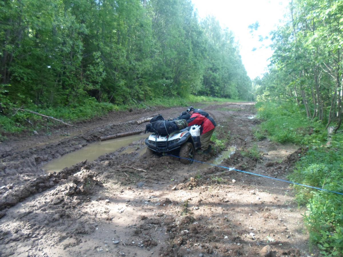 Проф Опубликовано 17 июля, 2013 Опубликовано 17 июля, 2013 Через тернии к р.Ульвич (рассказ) Иногда приходится действовать быстро. Для поездки на Ульвич пришлось быстро взять отпуск, быстро собраться и преодолеть много трудностей. Давно с другом хотели повторить вояж на квадроцикле (однажды довелось прорваться на Верх-Косьву). Времени в обрез. Не у меня конечно, а у друга. Я то теперь в отпуске и радостно предвкушаю это блаженное время. Его же жена с трудом отпустила на 1.5 дня. Ехать сразу в первый день отпуска я отказался на отрез: «Технику нужно перегнать и проверить. Собраться основательно»… Еду забирать квадр. Он в производственном владении и с зимы стоял без движения 3 месяца. В баке мало-мало, но до заправки хватило. И вот на полпути к дому оказалось, что температура движка подступила к 120 градусам! А вентилятор системы охлаждения предательски молчал. Ну-у, вот началось! Пришлось возвратиться. Диагноз поставил быстро – датчик включения вентилятора умер. Поиски в городе ничего не дали (очень предсказуемый результат). Но поехать то очень охота. Из двух проводов и выключателя, смастерил перемычку в обход неисправного датчика. Проверил – работает. Теперь я сам вместо датчика буду))). Поднялась температура – включаю, опустилась – выключаю. Просто и надёжно. До дома долетел как на крыльях. Собрал вещи и спать. Утром выезжать. В 8-00 был уже у друга. Планировали добраться за 2-3 часа, к обеду. Обустроить лагерь и порыбачить вечером. Лишнего брать не хотелось. По опыту знали, что техника эта в час кушает 2-3 литра бензина, значит, бака в 25 литров хватит на 10 часов пути. Известно достоверно, что от дороги Яйва-Березники до деревни Камень прекрасная (для такой техники дорога). Около 20 км до Камня и там ещё 25-30 до р.Ульвич. Поэтому бензина решили не брать (как я потом пожалел об этом, никогда без канистры не поеду больше). И действительно до Камня доехали за час. Но дальше нас ждала очень разбирая глиняная дорога. Первые 5 км отняли час времени. И датчик уровня топлива неумолимо скатился ниже половины бака (сказался возврат на ремонт и пробеги до дома и дома товарища). Мы уже успели поупражняться с лебёдкой, а что нас ждёт дальше? Фото 1. Упражнения с лебёдкой. Квадр на пузе. Оптимизм растаял на глазах. Приняли решение вернуться для дозаправки. Слава Богу, что так. Поступи мы иначе – попали бы мы по крупному. Глухомань там полная. Дабы не трястись вдвоем, на обратном пути оставил весь груз и друга на впадении р. Ик в р.Яйву. Он порыбачит пока. Фото 2. Насыпной мост через р.Ик. Еду и с опаской поглядываю на последние деления шкалы уровня топлива: «Дотянуть бы до Яйвы». Ругал себя всю дорогу, за свою наивность, непредусмотрительность и прочие пороки. Как дети малые, мечемся туда-сюда. Просто охота бросить всё и уйти со стыдом(((. Ещё ко всему желая объехать плохой участок дороги по полям, плутанул на несколько километров. Напоролся в полях на какой-то табор людей (толи цыган, толи других каких бродяг). Они оторопели от такого неожиданного «наезда» незваного гостя, от дороги они хорошо притаились. Я тоже слегка оробел. Их много, а я один и видно, что заблудился… На выезде с Вижайского отворота на Яйву, остановился на большой свалке строительного мусора, которая стихийно разрастается там, что бы найти какую-нибудь тару для запаса бенза. Нашел пару 5-и литровых бутылок. Последнее делен