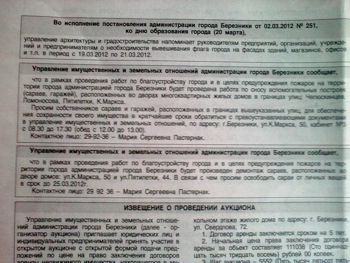 нивковод Опубликовано 18 марта, 2012 Опубликовано 18 марта, 2012 УПРАВЛЕНИЕ ИМУЩЕСТВЕННЫХ И ЗЕМЕЛЬНЫХ ОТНОШЕНИЙ АДМИНИСТРАЦИИ ГОРОДА БЕРЕЗНИКИ сообщает о подведении итогов торгов на право аренды земельных участков, состоявшихся 12 марта 2012 года: Лот № 4. Право аренды земельного участка, расположенного северо-западнее дома № 11 по ул. Аксакова, г. Березники, с кадастровым номером 59:03:0300002:14, площадью 10 300 кв.м для проектно-изыскательских работ и строительства в соответствии с видами разрешенного использования для зоны малоэтажных жилых домов с приквартирными земельными участками (Ж-3). Срок аренды – пять лет. По установленному критерию победителем торгов признано – ООО «СМТ «БШСУ» Наверно это под таунхаусы)))