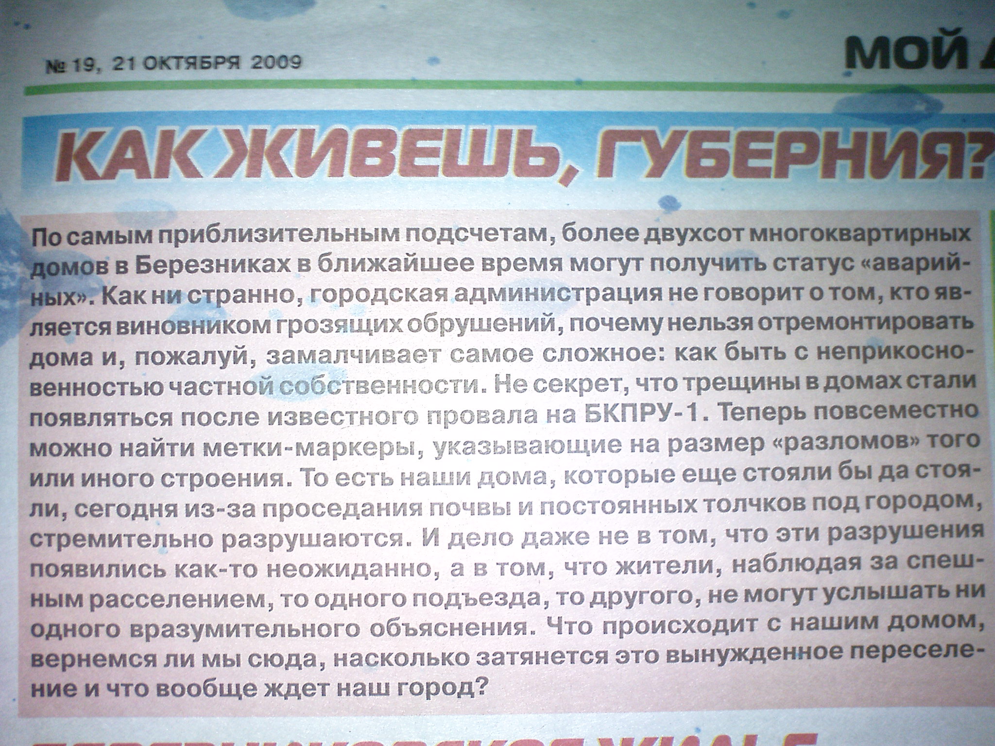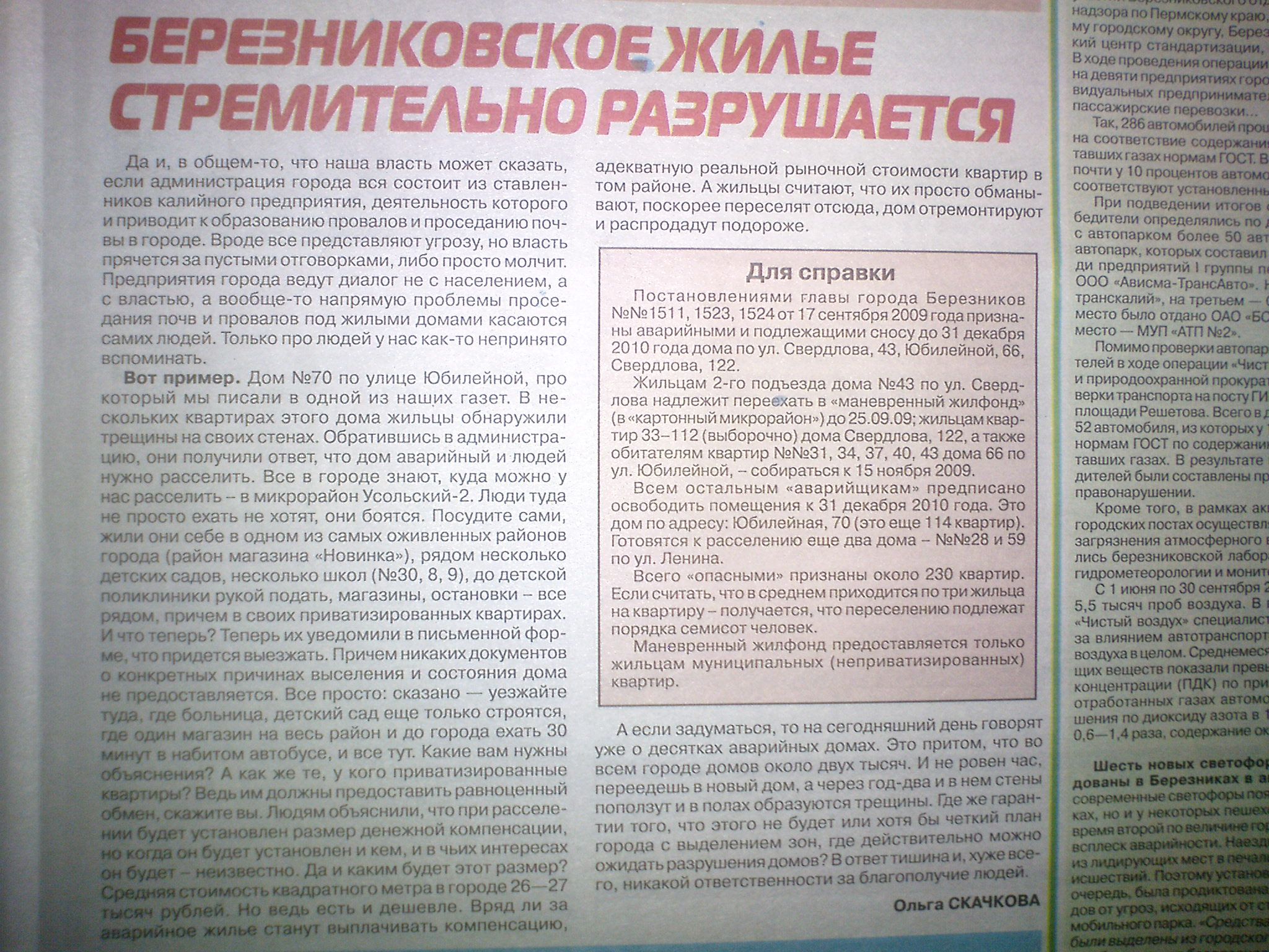 check Опубликовано 21 ноября, 2009 Опубликовано 21 ноября, 2009 заместитель председателя правительства Пермского края Елена Зырянова: 23.10.2009 г. Государственной инспекцией вневедомственного контроля (далее - ГИВ) была проведена очередная выездная проверка по факту обращения жителей жилых домов, расположенных по адресам: ул. Свердлова, д.122, ул. Юбилейная, д.70. Вопрос о неудовлетворительном техническом состоянии указанных домов ГИВ рассматривался ранее. Причиной неудовлетворительного технического состояния жилых домов явилось расположение зданий на участке земли, на котором во время аварийного затопления рудника БКРУ-1 ОАО «Уралкалий» активизировался процесс оседаний земной поверхности. В связи с чем, конструктивные элементы зданий подверглись деформации, утратили свою первоначальную прочность. В результате чего существует угроза безопасному проживанию жителей. Учитывая данные факты, по требованию Государственной инспекции вневедомственного контроля Пермского края администрацией города Березники проведено заседание межведомственной комиссии еще в августе 2009 г.. Согласно Заключениям о признании жилого помещения пригодным (непригодным) для по-стоянного проживания от 07.08.2009 № 75, 78 жилые дома, расположенные по адресам: ул. Свердлова, д.122, ул. Юбилейная, д.70, признаны аварийными и под-лежащими сносу. На основании указанных заключений постановлениями главы города Березники от 17.09.2009 № 1522, № 1524 данные жилые дома в срок до 31.12.2010 подлежат сносу; собственники жилых помещений, в которых существует угроза безопасному проживанию жителей, обязаны освободить занимаемые помещения в срок до 15.11.2009 и воспользоваться предоставленным маневренным фондом. Жилые помещения маневренного фонда предназначены для временного проживания граждан, у которых единственные жилые помещения стали непри-годными для проживания в результате чрезвычайных обстоятельств (ст. 95 Жи-лищного кодекса Российской Федерации). Согласно ст. 106 Жилищного кодекса Российской Федерации договор найма жилого помещения маневренного фонда заключается на период до завершения расчетов с гражданами, единственное жи-лое помещение которых стало непригодным для проживания в результате чрез-вычайных обстоятельств, либо до предоставления им жилых помещений муници-пального жилищного фонда. Расчеты с гражданами по выкупу жилых помещений должны быть завершены в сроки, указанные в соглашении о выкупе жилого по-мещения. http://chirkunov.livejournal.com/76167.htm...30439#t10530439 По моим данным, при ознакомлении собственников жилых домов, подлежащих расселению по адресам Юбилейная-Свердлова, с заключением о признании домов авариными - былы выдраны (изъяты) листы с заключением "Государственной инспекции вневедомственного контроля", в котором явно была указана причина признания домов аварийными (см.выше) . Было продемонстрировано лишь "лояльное" заключение ООО "Стройдиагностика". Налицо - подлог документов со стороны городской администрации. Не так ли?
