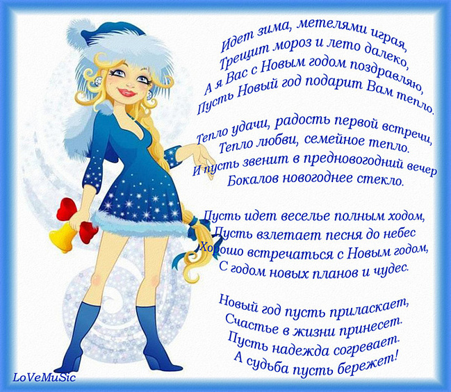 Т. Н. Опубликовано 31 декабря, 2013 Опубликовано 31 декабря, 2013 (изменено) с Новым годом!!!! Копыт перестук раздаётся, Под дугой колокольчиков звон, Это зимняя тройка несётся, Новый Год доставляя в наш дом. Вы столы накрывайте скорей И в бокалы налейте вина, И давайте мы будем добрей, Чтобы стала добрее страна. Пусть исполнятся наши мечты, А у нас их с тобой о-го-го! На земле пусть не будет вражды, И на душах, чтоб стало легко. Чтобы не было слёз у детей, А в домах только радостный смех. Пусть дурных не приходит вестей, Чтобы слово забыли мы- грех. Дед Мороз пусть в санях привезёт, Нам подарки, что пахнут зимой… И под ёлочкой каждый найдёт, Свой подарок, в коробке цветной. Чтобы в жизни успех, не на час. Будет трудно, не падай- держись! Вот за это давайте сейчас Бокалы поднимем мы ввысь. Пусть шампанского брызги вокруг! И салюты, и крики «Ура!» С Новым годом и счастьем, мой друг Нам поздравить друг друга пора Изменено 31 декабря, 2013 пользователем ТАТЬЯНА НИКОЛАЕВНА