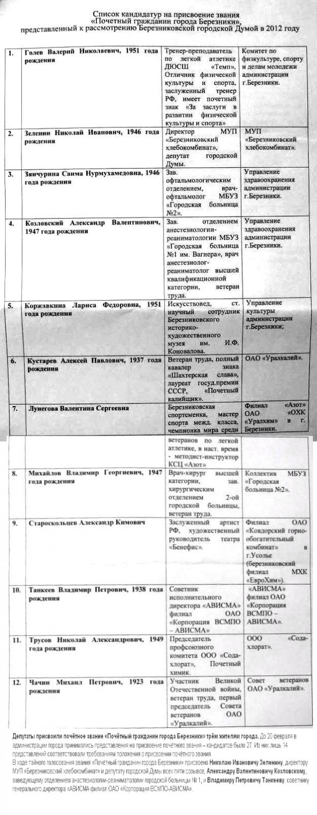 GARRY6490 Опубликовано 19 мая, 2012 Опубликовано 19 мая, 2012 Дык Зеленин уже в автори...(тьфу ты...) в Почете... Надо будет список запросить в ГА, кто претендовал на звание Почетного Гражданина на 2012 год... Мало верится в то, что остальные 10 из 13 менее достойные... Пожалуй сам себя и продолжу. Получен ответ из ГА по кандидатурам на Почетное Гражданство (зачет Наталье Николаевне за скорость, но на слабую троечку за инфу). Интересно, куда пропало ещё два кандидата из 14 и был ли мальчик? Ну и само собой, не все организации, выдвигавшие кандидатов, представлены. Насколько я помню, Зеленина выдвигал совет бабушек его округа. Но тем не менее - кого бы выбрали вы, если бы вам было предложено Интернет-голосование? (С положение о ПГ я не знаком - может там нельзя более одного человека от отрасли и два врача не котируются? Мне кажется, что Зянчурина была бы уместнее в Почетных гражданах, чем Зеленин). Да и товарищи с Доски Почета-2011 мне кажутся уважаемее. Только их никто не представил на это звание. ЗЫ Нифигасе, у 2-ой горБольницы есть свой сайт? 1