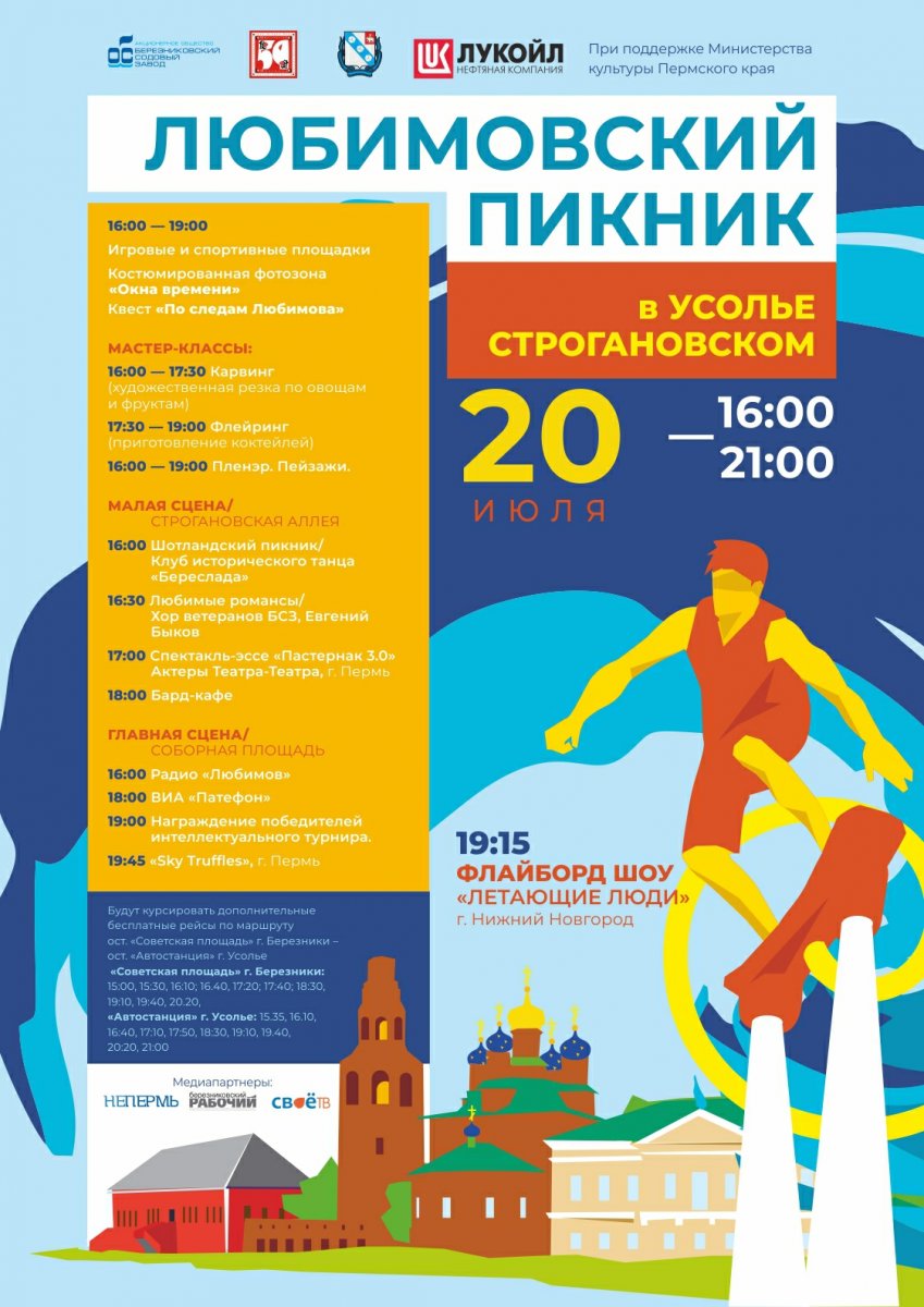 RomanIzrailevich Опубликовано 19 июля, 2019 Опубликовано 19 июля, 2019 20 июля на территории историко-архитектурного комплекса «Усолье Строгановское» пройдет традиционный фестиваль «Любимовский пикник». Мероприятие проводится при поддержке АО «Березниковский содовый завод», ООО «Лукойл-Пермь», администрации города Березники в рамках проекта «59 фестивалей 59 региона» при поддержке Министерства культуры Пермского края. На время праздничных мероприятий будет организовано движение бесплатных автобусов-шатлов. График движения автобусов-шатлов по маршруту: остановка «Советская площадь» г. Березники – остановка «Автостанция» г. Усолье «Советская площадь» г. Березники: 15:00, 15:30, 16:10; 16:40, 17:20; 17:40; 18:30, 19:10, 19:40, 20:20; «Автостанция» г. Усолье: 15:35, 16:10, 16:40, 17:10, 17:50, 18:30, 19:10, 19:40, 20:20, 21:00. ГА Программа по выше ссылке. Гуляли там сейчас. Подготовка идет) "традиционный"... шпака помню, ревень... этого не помню))) 1