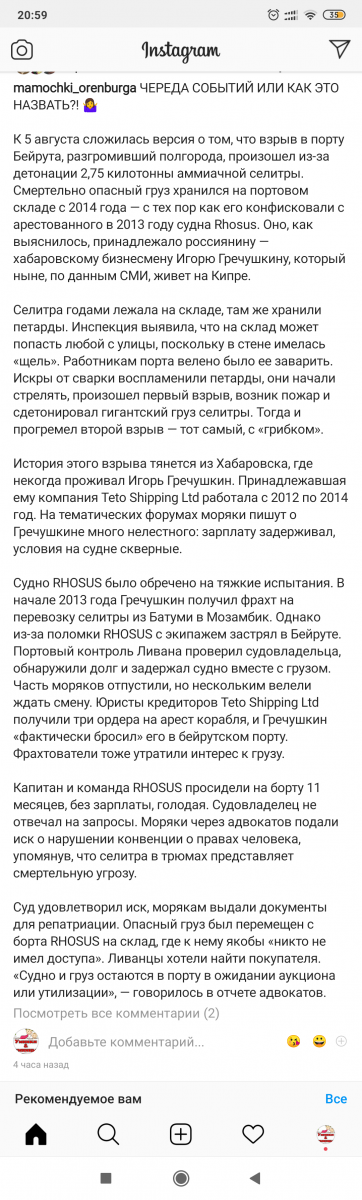 jimm031 Опубликовано 5 августа, 2020 Опубликовано 5 августа, 2020 По некоторым сведениям на судне была таки грузинская амселитра вот этого производителя https://rustaviazot.ge/product/ammonium_nitrate а австралиская амселитра просто хранилась где-то рядом на складе и не сдетонировала(содержание меньше)