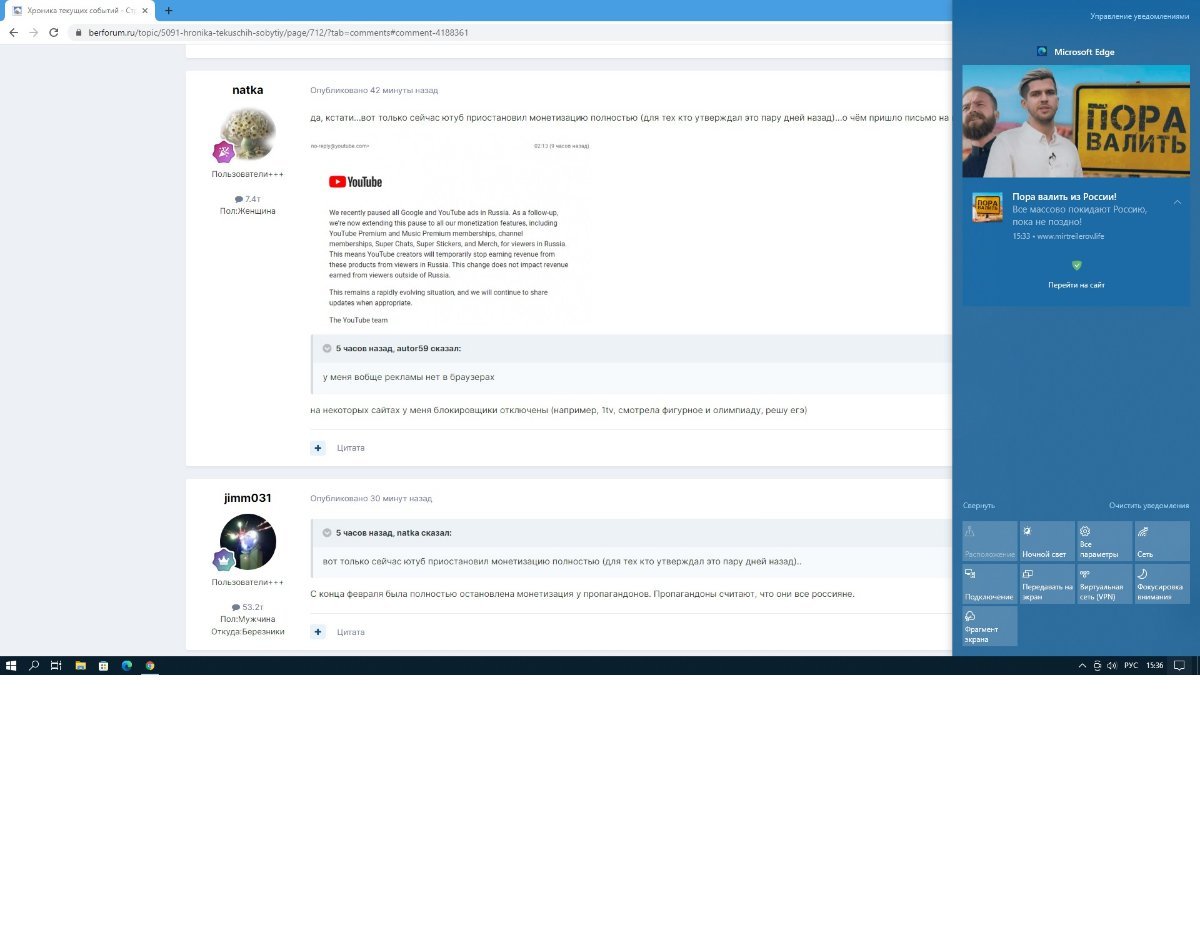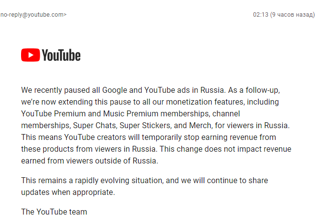 natka Опубликовано 10 марта, 2022 Опубликовано 10 марта, 2022 да, кстати...вот только сейчас ютуб приостановил монетизацию полностью (для тех кто утверждал это пару дней назад)...о чём пришло письмо на почту) 6 минут назад, autor59 сказал: у меня вобще рекламы нет в браузерах на некоторых сайтах у меня блокировщики отключены (например, 1tv, смотрела фигурное и олимпиаду, решу егэ)