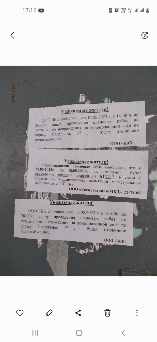 jimm031 Опубликовано 17 мая, 2023 Опубликовано 17 мая, 2023 Больше суши богу суши. Завтра, 18 мая, с 12:00 до 20:00, в связи с проведением плановых ремонтных работ на водозаборе «Усолка» возможны перебои с водой и заниженное давление в высоких точках города в следующих районах: - п. Чупино, - д. Пермякова, - п. Дурино, - ул. Дедюхинская, - ул. Гражданская, - ул. Хользунова, - район «Абрамово» и бывшего 45го магазина, - район 2 городской больницы, - микрорайон Еврохим. В квадратах улиц: • ул. Черепанова – Пятилетки – Мира - Юбилейная; • ул. Хользунова – Юбилейная – Свердлова - Парижской Коммуны; • ул. Свердлова – Юбилейная – Мира; • ул. В. Бирюковой – Черепанова – Пятилетки - Л. Толстого. https://vk.com/wall-188123740_1991 21 мая, с 0:00 до 8:00, в связи с проведением плановых работ по замене ЗА ДУ300 на ВНС-18, будет отсутствовать водоснабжение по следующим адресам: — ул. Свердлова, 29а, 31, 31а, 33, 33а, 35, 37, 39, 41, 45, 47, 49, 51, 51а, 55, 57, 59, 61, 63, 65а, 67, 69, 71, 72, 73, 75, 77, 81, 82, 84, 86, 97, 98, 99, 100, 101, 102, 104, 106, 114а, 116, 118, 120, 128, 130, 132, 134, 136, 138, 140, 142, 144, 146, 148, 150, 152, 154, 158, 160, 162, 164, 166, 168, 170, 172, — ул. Юбилейная, 24, 26, 28, 30, 31, 32, 34, 35, 36, 40, 42, 43, 44, 45, 46, 48, 50, 51, 53, 54, 55, 57, 59, 61, 62, 63, 65, 69, 69а, 71, 72, 73, 74, 75, 77, 79, 81, 82, 83, 84, 85, 86, 87, 91, 93, 95, 97, 101, 103, 105, 111, 113, 115, 117, 119, 121, 125, 129, 131, 133, 135, 137, 141, 143, 145, 147, — ул. Ломоносова, 46, 48, 52, 54, 58, 66, 68, 70, 73, 74, 75, 76, 77, 78, 79, 81, 82, 83, 84, 85, 86, 87, 88, 89, 91, 92, 93, 94, 95, 96, 97, 99, 100, 101, 103, 105, 106, 108, 109, 110, 117, 117а, 119, 121, 123, 129, 131, 131а, 133, 135, 137, 139, 141, 143, 145, 147, 147а, 149, 151, 153, — ул. П.Коммуны, 3, 7, 9, 10, 11, 12, 15, 16, 21, 24, 26, 28, 30, 32, 34, 40, 42, 44, 46, 48, 50, 52, 54, — ул. Черняховского, 4, 5, 7, 9, 10, 12, 14, 16, 30, 32, 34, 36, 38, 45, 47, 49, 51, 53, 55, 57, 59, 61, 63, — ул. Хользунова, 78, 78а, 80, 80а, — ул. Суворова, 56, 89, — ул. Ленвенская, 25, 27, 29, 30, — ул. Монтажников, 3, 7, 9, — ул. Ермака, 61, 63, 65, 66, 67, 68, 69, 71, 73, — ул. Л. Толстого, 11, 13, 17, 19, 19а, 21, 23, 25, 33, 42, 44, 56, 62, 66, 68, 70, 72, 74, 79, 80, 82, 84, 86, 88, 90, 92, 94, 96, 98, — ул. Ур. Танкистов, 59, 61, 64, 68, — ул. В. Бирюковой, 8, 10, 12, 14, 16, 18, — ул. Черепанова, 11, 12, 13, 18, 20, 20а, 22, — пр. Советский, 37, 41, 47, 49, 51, 53, 55, 57, 58, 59, 60, 61, 61а, 62, 63, 64, 65, 66, 68, 70, 72, 74, 75, — ул. Пятилетки, 44, 46, 47, 48, 51, 50, 53, 54, 55, 56, 57, 58, 60, 62, 67, 69, 73, 75, 77, 79, 81, 83, 85, 87, 89, 99, 101, 103, 105, — ул. Гагарина, 5, 6, 8, 12, 16, 18, 22, 20, 24, 26, 28, 30, 32, — ул. Челюскинцев, 25, 27, 29, 31, 33, 35, 37, 39, 41, 43, 45, 47, 49, 51, 53, 55, 57, 59, 61, — ул. Мира, 29, 31, 32, 33, 34, 36, 37, 38, 39, 41, 43, 45, 47, 49, 51, 53, 56, 58, 62, 64, 65, 66, 67, 69, 70, 71, 72, 73, 74, 75, 76, 79, 80, 81, 83, 84, 85, 86, 87, 88, 89, 90, 91, 92, 93, 94, 96, 98, 99, 100, 101, 102, 103, 104, 105, 106, 107, 108, 110, 112, 116, 118, 120, 122, 124, 128, 130, — ул. Потемина, 1, 4, 6, 6а, 7, 8, 9, 10, 11, 12, 13, 14, 16, — Абрамово, — Кропачево, — Микрорайон Еврохим.https://vk.com/wall-188123740_1992