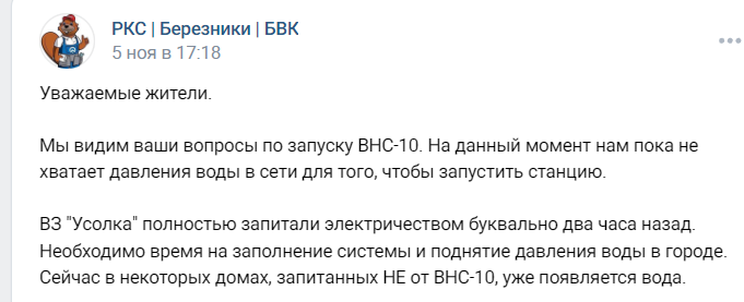 jimm031 Опубликовано 9 ноября, 2024 Опубликовано 9 ноября, 2024 СлухАнал Линию на водозабор Извер в Березниках не удалось включить. На повреждении. Водозабор снабжается электричеством от двух дизель-генераторов. #НамПишут https://t.me/SluhavoiAnalizator/4881 Сегодня, 9 ноября, с 11:00 до восстановления режима водоснабжения, в связи с аварийным отключением электричества на ВЗ Извер и Усолка, возможно заниженное давление или полное отсутствие водоснабжения: — высокие точки города, — Дурино, — Пермякова, — Чупино, — Суханово, — Николаев Посад, — ул. Гражданская, — ул. Хользунова. После возобновления водоснабжения воду рекомендуется употреблять в кипяченом виде в течение трех дней. https://vk.com/wall-188123740_11656