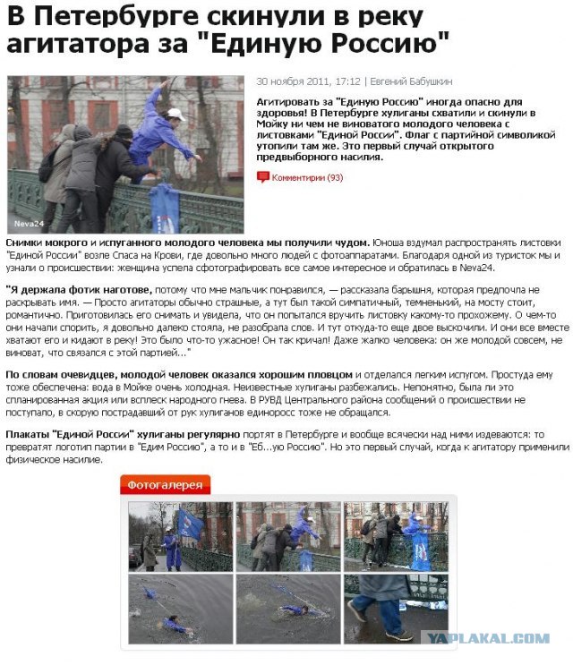 kross Опубликовано 1 декабря, 2011 Автор Опубликовано 1 декабря, 2011 Куда ни кинь... Очень много людей звонит, останавливают на улице, приходят в Фонд - спрашивают: "За кого голосовать на выборах?" А я что отвечу? Алексей navalny предложил голосовать за любую партию, кроме ЕР. Можно и так. Главное, чтоб не стошнило. Для меня это не выход. Потому, что я знаю ситуацию изнутри. Аргументы? Пожалуйста: 1) Коммунисты? - Никогда в жизни. Даже по приговору Верховного суда. Хотя бы потому, что, когда они были у власти, других партий просто не было! И шансов не было. И не полемизировали они с оппонентами, а шельмовали, ссылали, расстреливали, сажали в тюрьмы и держали в психушках... Что, не так?! И снова им власти захотелось. Еще и местами торгуют. 2) ЛДПР? - Сам-то понял, что сказал? Управляются они из того же центра, что ЕР. Говорят, что хотят. Делают, что скажут. По законопроектам, внесенным Правительством, дают такое количество голосов, какое им велят. Подстраховывают ЕР. Ну, и нормальному человеку вообще трудно отдать свой голос за ЛДПР. Эти тоже местами торгуют. 3) Справедливая Россия?! - Ну-ну. Особенно, если нравится дрессированный выхухоль. Обещают справедливости добиться? А чего ж не добивались-то, когда Миронов был третьим человеком в государстве и контролировал все голосование в Совете Федераций?! Что-то не слышал я, чтобы он хоть раз пошел на конфликт с Кремлем из-за принципов. Миронов - трусоватый и выдохшийся человек, несколько раз запятнавший себя предательством. Друг его, Левичев - еще более трусоватый, корыстный и, при этом, очень гнилой. Что, первый раз слышите? Есть там несколько приличных людей: Хованская, Шеин, Оксана Дмитриева, но не они решают. СР - партия никчемушников, овладевшая грозной риторикой, которая ни к чему не обязывает, и за которую ничего не будет. Тоже умение. Бегают к Суркову, отчитываться по каждому шагу. Местами тоже торгуют. Ты спросишь: "Когда же это все кончится?" Да вот, в общем-то все и кончилось. Осталось "Яблоко" и "Патриоты". Я бы проголосовал за "Яблоко", но шансов не вижу и боюсь, что голоса перераспределятся. А, еще же "Правое дело"! - В микроскоп не вижу. Вот и все. Обложили. Я видел, как это происходит, когда принимали поправки, когда убирали графу "против всех" и порог явки. Думаю, что унесу бюллетень, или испорчу. Просто, чтобы не участвовать. PS. На всякий случай, напоминаю, что слова "Гондоны", "Козлы" и прочие добрые пожелания, высказанные в графе "Единая Россия", считаются голосами, отданными за "Единую Россию"... http://roizman.livejournal.com/ Сейчас принесли кучу макулатуры: газета цветная,календарь большой,календарь маленький, брошюра и еще какая-то хрень. Агитатор сразу же стала говорить о великих делах педросни в Березниках. И попросила расписаться, что мы получили эти рекламашки. На мой вопрос, кто возглавляет ПВиЖ в Березниках, агитаторша помолчала и предположила - "Мотовилов"? Патсталом!!! :lol: Выяснилось, что этих женщин еще 7лет назад нанимали. Видео удалено с ютуба Вот,только фото с комментами.