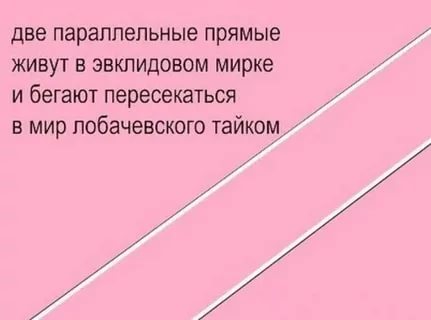 Гость Kis.(Кисточка) Опубликовано 28 мая, 2018 Опубликовано 28 мая, 2018 (изменено) Ой, я вас умоляю, какие могут быть трения у параллельных прямых? - Мы не можем быть вместе, понимаешь? Параллельные прямые не пересекаются... - Зови меня Лобачевским, детка. Распушите уши и послухайте сюда, это ви мне, маме математика, будете рассказывать про параллельные прямые, которые настолько параллельны, как и рельсы. Но, если ви умеете смотреть вдаль, ви таки увидите, как они окажутся в одной точке. Вас научить как посмотреть вдаль? Гребанный комп Изменено 28 мая, 2018 пользователем Kis.(Кисточка)