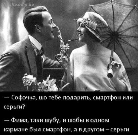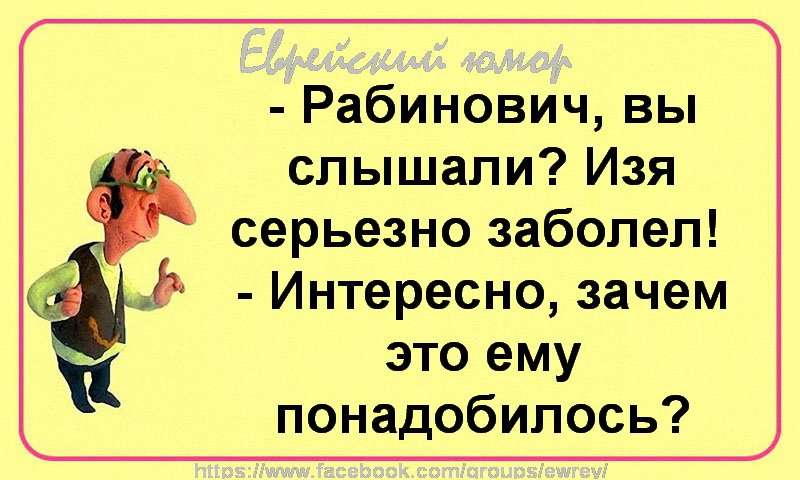 Гость Kis. (Кисточка) Опубликовано 22 февраля, 2019 Опубликовано 22 февраля, 2019 (изменено) — Абрам, представляешь, на упаковках презервативов пишут «Использовать до 2018 года». Зачем они на меня давят? К чему эта спешка? *** — Я веду здоровый образ жизни... — У тебя же в рюмке коньяк! — А разве это не здорово?! *** — Господин министр, говоря о нашей экономике, вы сказали бы, что стакан наполовину пуст или наполовину полон? — Я сказал бы, что стакан украли вчера. Изменено 22 февраля, 2019 пользователем Kis. (Кисточка)
