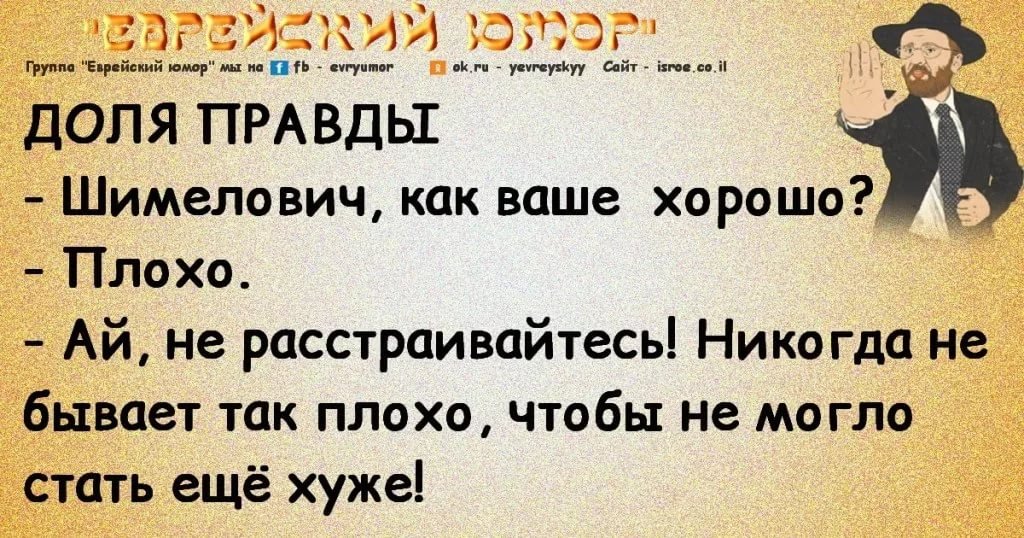 Гость Kis. (Кисточка) Опубликовано 9 марта, 2019 Опубликовано 9 марта, 2019 -Дорогой, за двадцать лет семейной жизни ты мне хоть раз изменял?-Розочка, дорогая, только один раз!Ты в то время сильно болела.-Сёма!!! А когда это я так болела, шо аж лежать не могла? Вы думаете, Фима, шоя таки если болею, значит не смогу тыкать пальцем? — Шо с Вами, Роза? Вы так похудели.— Та я так переживаю, аж не могу.— А що такое?— Муж стал изменять.— Таки разведитесь.— Щас не могу, хочу еще 5 кило скинуть.