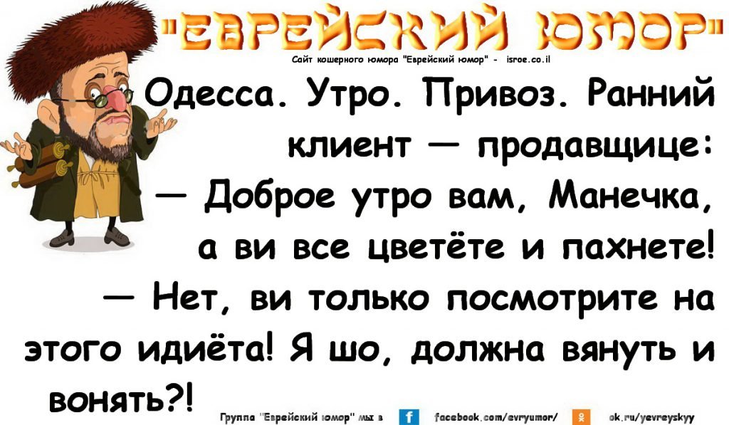 Гость Kis. (Кисточка) Опубликовано 16 мая, 2019 Опубликовано 16 мая, 2019 В старой одесской школе:- Господин учитель, - спрашивает ученик, - какая разница между мужчиной и женщиной?- Мальчик, - спрашивает учитель. - А какой размер обуви носит твой папа ?- Сорок третий.- А твоя мама ?- Тридцать восьмой.- Так разница, мальчик, между… ногами. *** - Ой, Фима, да мы знакомы с Вами пять минут, и Вы хотите уже стать обладателем моего сердца?- О, Сарочка, дорогая, поверьте, я не целюсь так высоко! *** Ночью в постели:- Сара, мои акции повышаются!- Ничего не поделаешь. Биржа закрылась.- Мои акции устойчивы как никогда!- Я же сказала: биржа закрыта… (после паузы) Фима, биржа открылась!- Слишком поздно. Акции сбыты за бесценок…