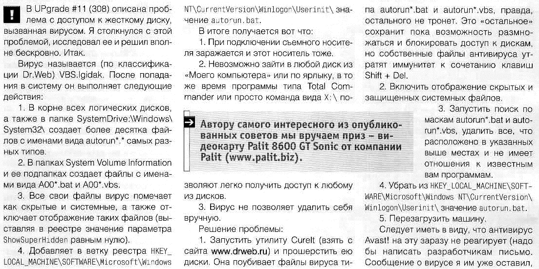 Гость mik Опубликовано 5 августа, 2008 Опубликовано 5 августа, 2008 ну напиши мне тогда ПОДРОБНЫЙ ответ, как это сделать вручную. десяток раз такое встречал и яндекс и чё только не юзал другого решения кроме форматирования нета ты не замечал что он обычно убивается вирусом одним и тем же? и после удаления антивирусником этого гавна и получается такая ошибка. http://www.viruslist.com/ru/search?VN=Virus.VBS.Small.a Ну и предварительно, если нормального файл-менеджера типа фара нет, то включаем показ скрытых/системных и отключаем автозапуск на всех дисках, разумеется. Удобно пользоваться Hijack This! и AVZ - разные модификации видел, не факт, что ограничиться нужно будет только тем, что написано по ссылке выше. А вообще - с помощью этих двух (ну разве что еще пару утилит от Sysinternals еще добавить, для быстроты и удобства) можно убить любой вирус/троян в системе любой степени запущенности :) П.С-использую только НОД32, другие антивири даже за антивири не считаю, и меня никто в этом не переубедит :) Я уже тут как-то писал - после того, как в этом году один из важных, а потому защищенных (со всеми апдейтами от MS и файрволлами, антивирус - NOD32) и регулярно проверяемых, компов словил вирус 2005-го года (!) - мнение о ноде сложилось единственно возможное :be: Другие, впрочем, тоже далеко не идеал.