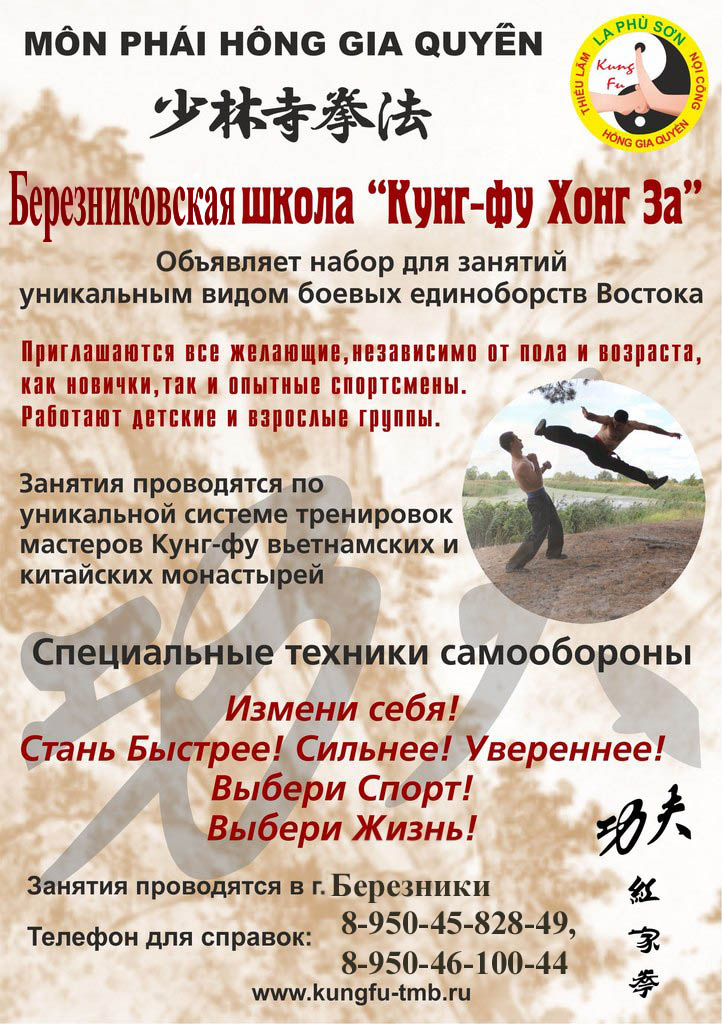 daoinfinity Опубликовано 11 ноября, 2012 Автор Опубликовано 11 ноября, 2012 Здравствуйте! По форме одежды, нужны лишь штаны и футболка, по желанию кеды. После года обучения, по желанию, можно приобрести шест, нун-чаки и т.п. Группа состоит больше чем из двадцати человек, но приходят на занятия не все сразу, как раз из-за графика работы. Инструкторов двое. Возможность заниматься не в указанные часы тоже имеется и дополнительная плата не нужна, но чтобы со всем этим определиться, нужно начать ходить. Если ближайшее время не получиться прийти в указанные часы, то вот номер телефона второго инструктора с которым можно договриться на другое время: 89504610044 (Александр)