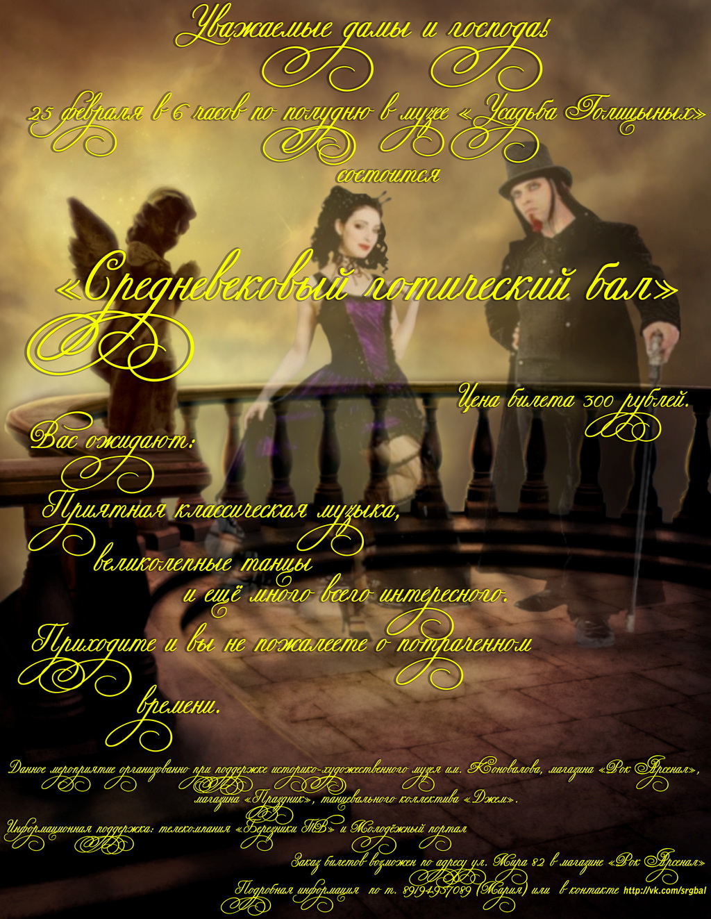 VITALY Опубликовано 4 февраля, 2012 Опубликовано 4 февраля, 2012 Уважаемые дамы и господа! 25 февраля в 18-00 в музее "Усадьба Голицыных" состоится "Средневековый готический бал" цена билета: 300рублей Вас ожидают: Приятная классическая музыка, великолепные танцы и еще много всего интересного. Приходите и Вы не пожалеете)) Данное мероприятие организовано при поддержке историко-художественного музея им. Корновалова, магазина "Рок Арсенал" магазина "Праздник" танцевального коллектива "Джем". Информационная поддержка "Березники ТВ", Молодежный портал, фотоклуб "ФотоЛаб" Заказ билетов возможен по адресу ул. Мира 82, в магазине "Рок Арсенал" Подробная информация по тел. 89194957089 Мария или в контакте http://vk.com/srgbal
