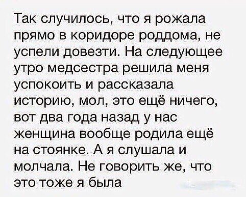 ★Hlebik★ Опубликовано 14 декабря, 2015 Опубликовано 14 декабря, 2015 У меня и роды долгие и схватки больнючие были, все как положено :) и одно желание было что бы поскорее все закончилось, а еще если муж тут со своим массажем и ухаживаниями и улюлюканиями бы был, меня бы лично это совсем не поддержало, а только расслабило..или еще как вариант, при очередной схватке послала б я его таааак, что долго б возвращался) зачем портить погоду в доме, я уж лучше сама :) Не знаю кому как, но массаж очень хорошо обезболивает схватку если помять где надо. Так что я его только наоборот умаляла ну помни )))) Он мне помогал, а не развлекал все 10 часов. Когда практически постоянно больно, трудновато передвигаться.... Роды вторые, первый раз всё было намного проще и рожала одна. Но когда лялик стал уже выходить, а я элементарно не поняла этого (потому что схваток не было) чуть там же его не придавила, а рядом не было не души. Ноги раздвинула и побежала звать помощь, что делать, раз всем приспичило чай попить)))