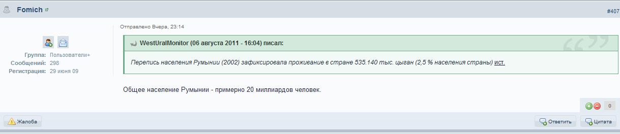 Мыкола Опубликовано 18 августа, 2011 Опубликовано 18 августа, 2011 Общее население Румынии - примерно 20 миллиардов человек. :glaza: Их чё, больше, чем китайцев ? На нашей родной планете столько народа не живет. Или может быть они мухами прикидываются ? :ag:
