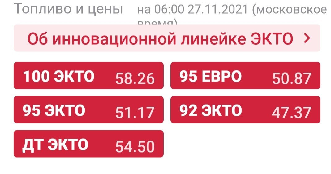 Andreyka74 Опубликовано 27 ноября, 2021 Опубликовано 27 ноября, 2021 ООО «ЛУКОЙЛ-Уралнефтепродукт» 100 ЭКТО +0,00 ₽; 95 ЕВРО +0,37 ₽; 95 ЭКТО +0,37 ₽; 92 ЭКТО +0,37 ₽; ДТ ЭКТО +0,70 ₽.