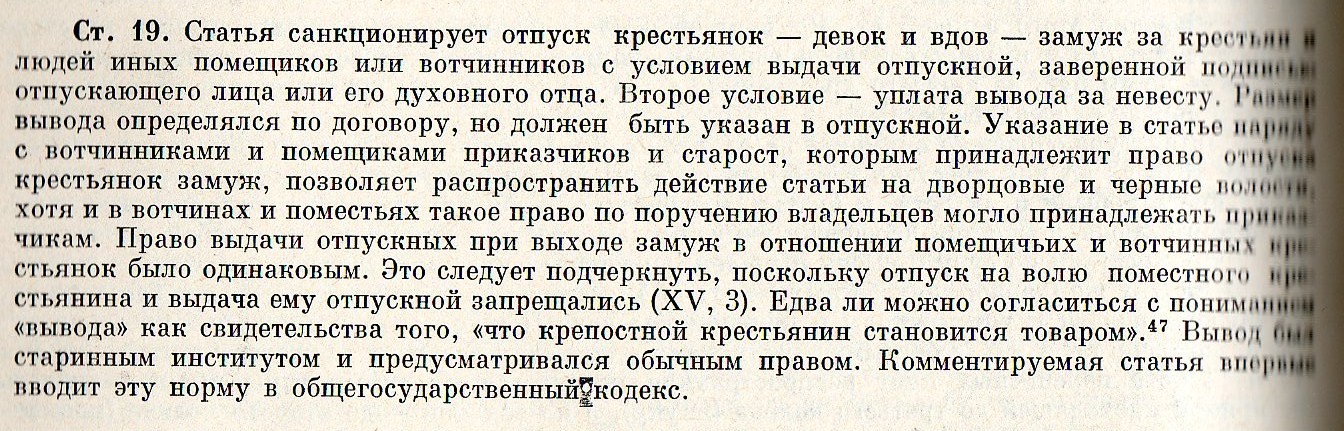 странник Опубликовано 18 января, 2011 Опубликовано 18 января, 2011 (изменено) "Соборное положение" Глава XI "Суд о крестьянах" ст. 19. А будет которой помещик или вотчинник ис поместья своего или из вотчины, или чьи приказчики и старосты, крестьянских дочерей девок или вдов учнут отпускать итти замуж за чьих людей или крестьян, и им тем крестьянским дочерям девкам и вдовам давать отпускные за своими или за отцов своих духовных руками, впредь для спору. А вывод имати за те крестьянские дочери по договору. А что кто выводу возьмёт, и то в отпускных писати имянно. По этой статье следует, что за девку, которую отдавали замуж за крестьянина другого хозяина, выплачивали определённую договорную плату. При этом писалась "отпускная", в которой указывалась эта плата. Так что прав я. Изменено 18 января, 2011 пользователем странник