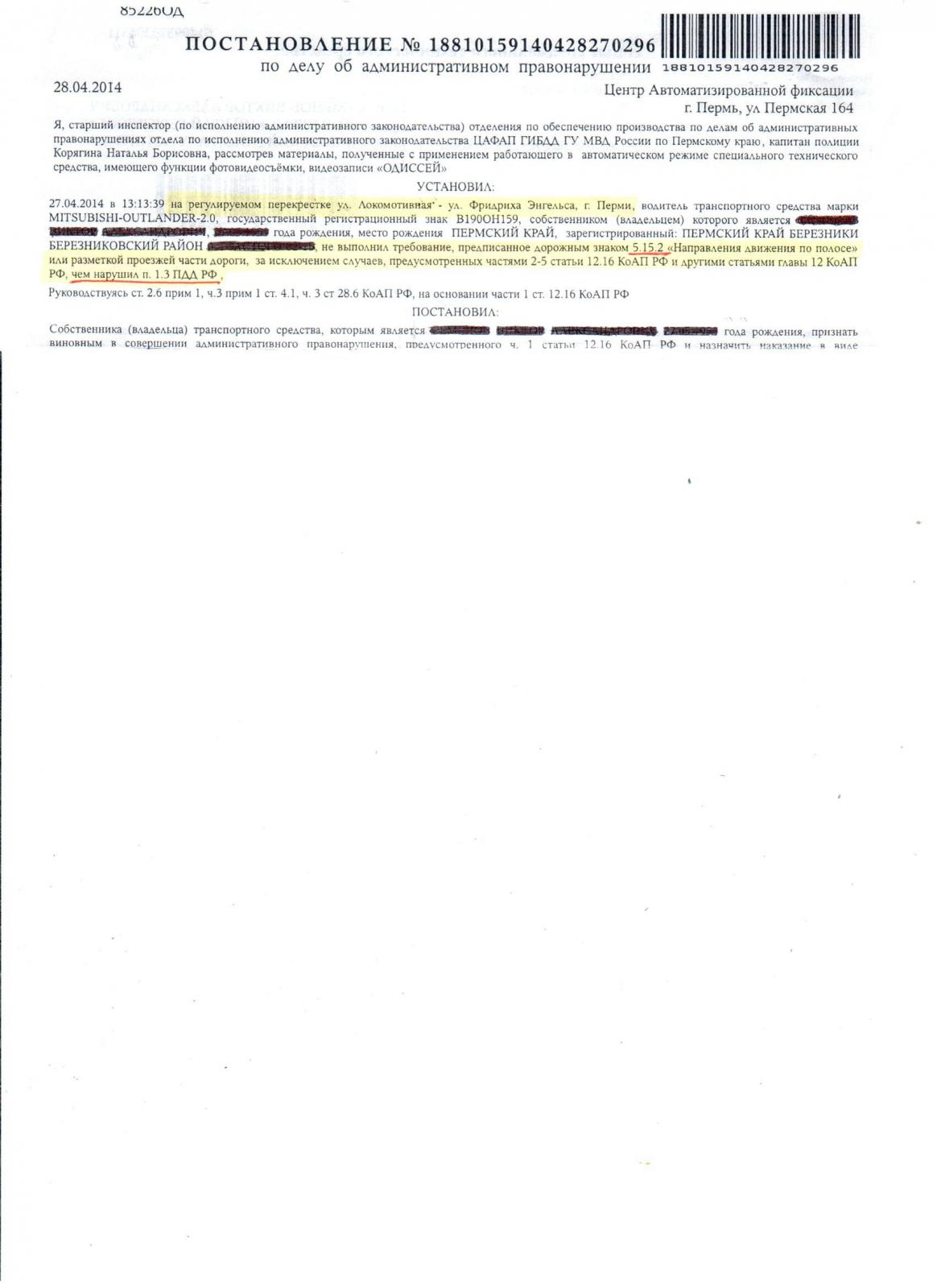 Гость WeLLa Опубликовано 14 мая, 2014 Опубликовано 14 мая, 2014 (изменено) Господа! Помогите разобраться! Пришло письмо с Перми о том, что мы нарушили правила при проезде на регулируемом перекрестке, формулировка такая: водитель ТС не выполнил требование, предписанное дорожным знаком 5.15.2 "Направления движения по полосе" или разметкой проезжей части дороги, за исключением случаев, предусмотренных частями 2-5 статьи 12.16 КоАП РФ и другими статьями главы 12 КоАП РФ, чем нарушил п. 1.3 ПДД РФ Прикрепила скан письма, выделила наш автомобиль. Пытаюсь понять законно ли нас оштрафовали. Мы поехали прямо по направлению дорожного знака, на зеленый сигнал светофора, разметки нет, нет четкого очертания полос, не ясно так же кто из всего потока автомобилей едет не по своей полосе. Поясню: волнует не столько штраф, сколько его законность. Стоит ли его оплачивать или проще обжаловать? И если обжаловать то возможно ли это сделать через местное ГИБДД? Изменено 14 мая, 2014 пользователем WeLLa