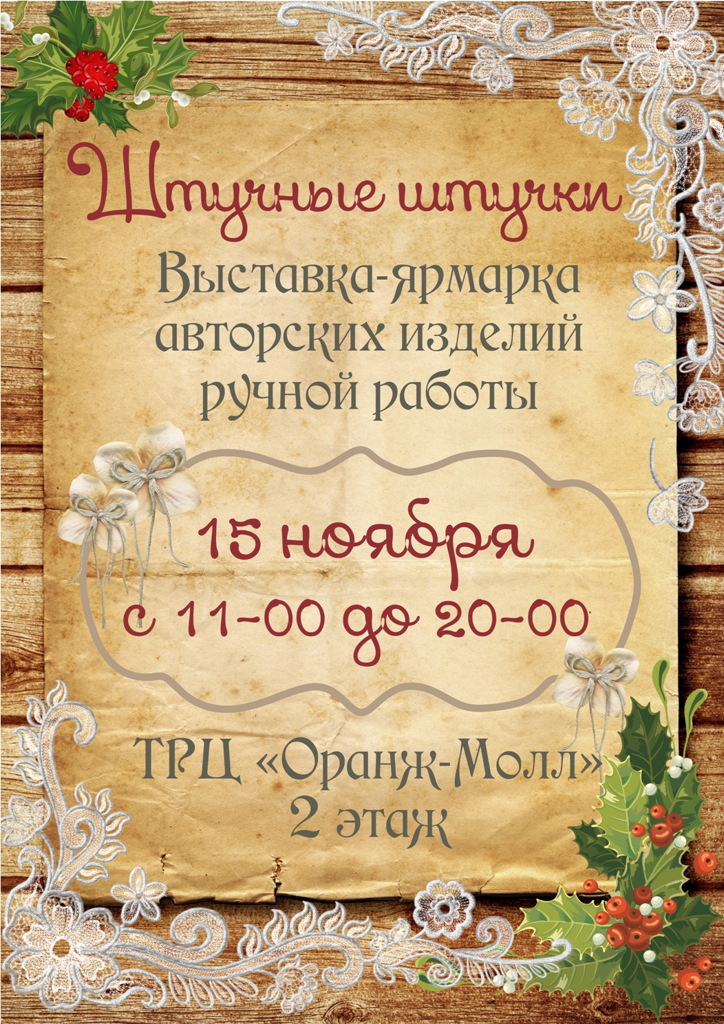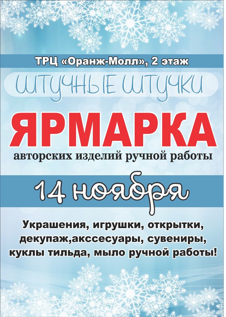 Avantyristka Опубликовано 11 октября, 2014 Опубликовано 11 октября, 2014 Всем доброго дня! ) Ближайшая ярмарка "Штучные штучки" пройдет 18 октября с 11-00 до 20-00 на втором этаже ТРЦ "Оранж-молл"! Приглашаем всех-всех-всех!